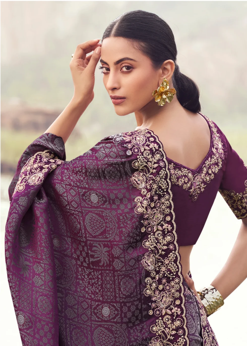 A deep wine silk saree with delicate embellishment of floral embroidered borders and designer blouse