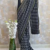 This is a black cotton saree with white floral motif print and a small border. A preferred office-wear/casual party-wear.