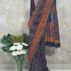 Dark blue soft cotton saree with green and rust tree motif print. See pictures for blouse piece. A preferred office-wear/casual party-wear.