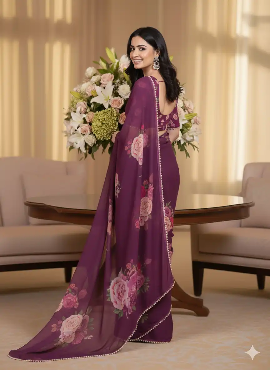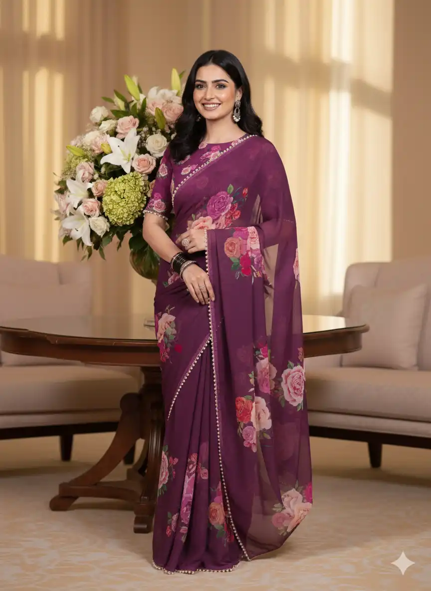 A cherry floral printed chiffon saree, , perfect for daytime soirees