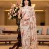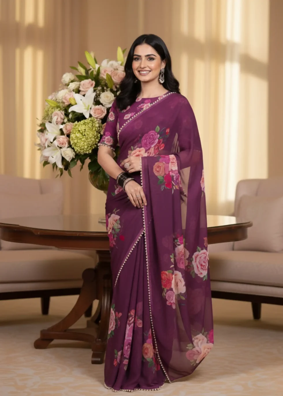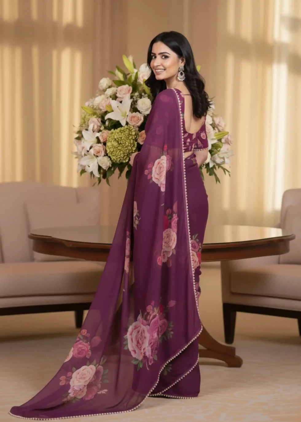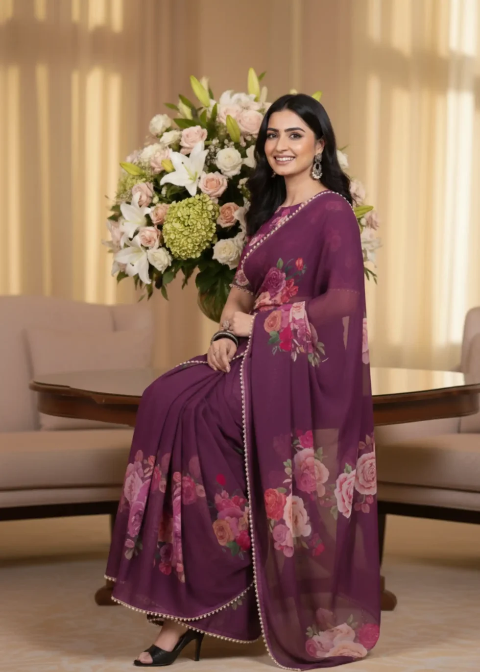 A cherry floral printed chiffon saree, , perfect for daytime soirees