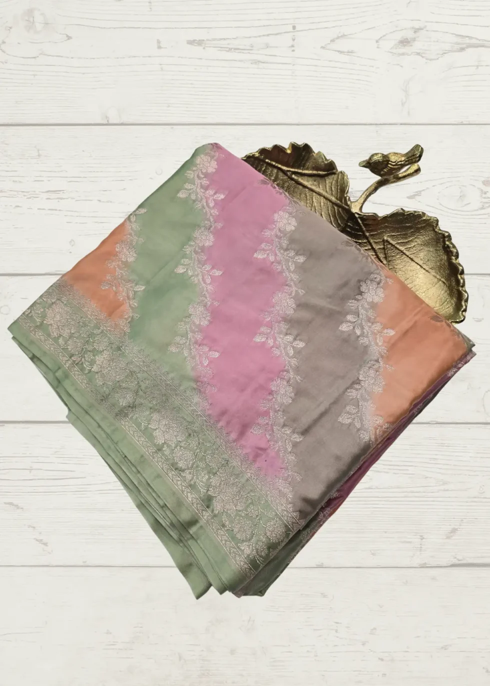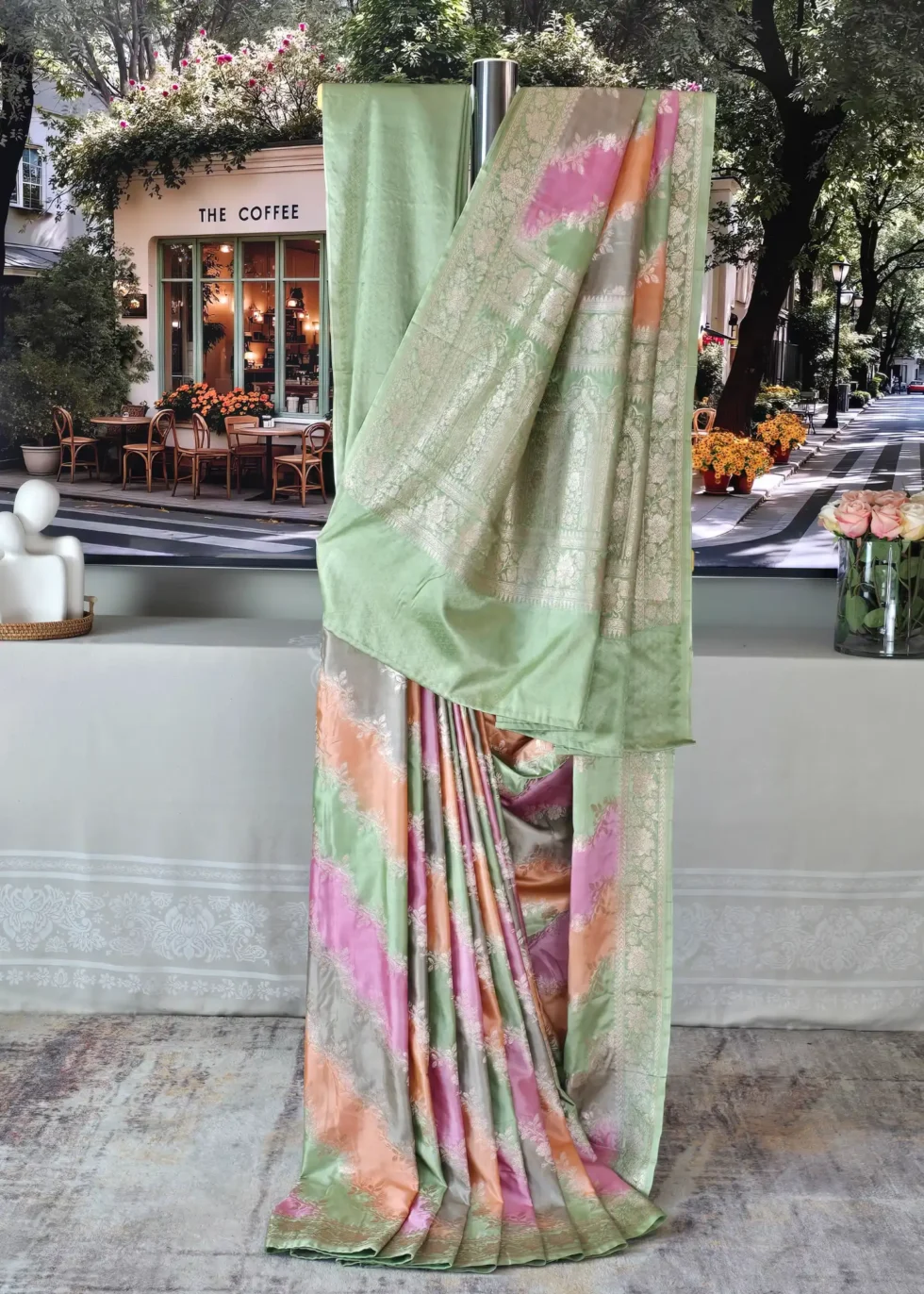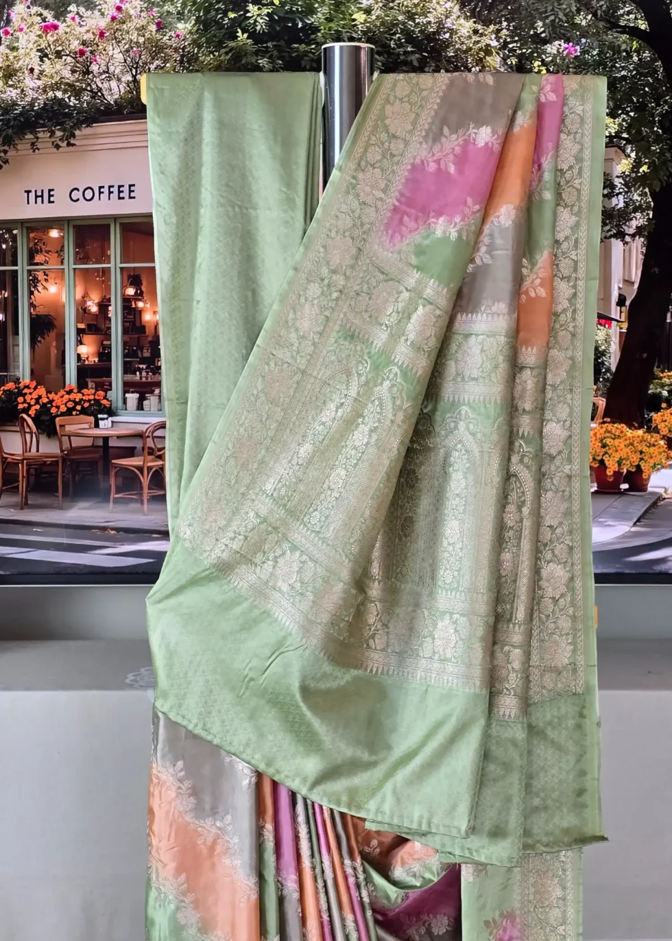 A Mashru silk Banarasi rangkatt saree in shades of pink, green, orange, grey