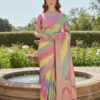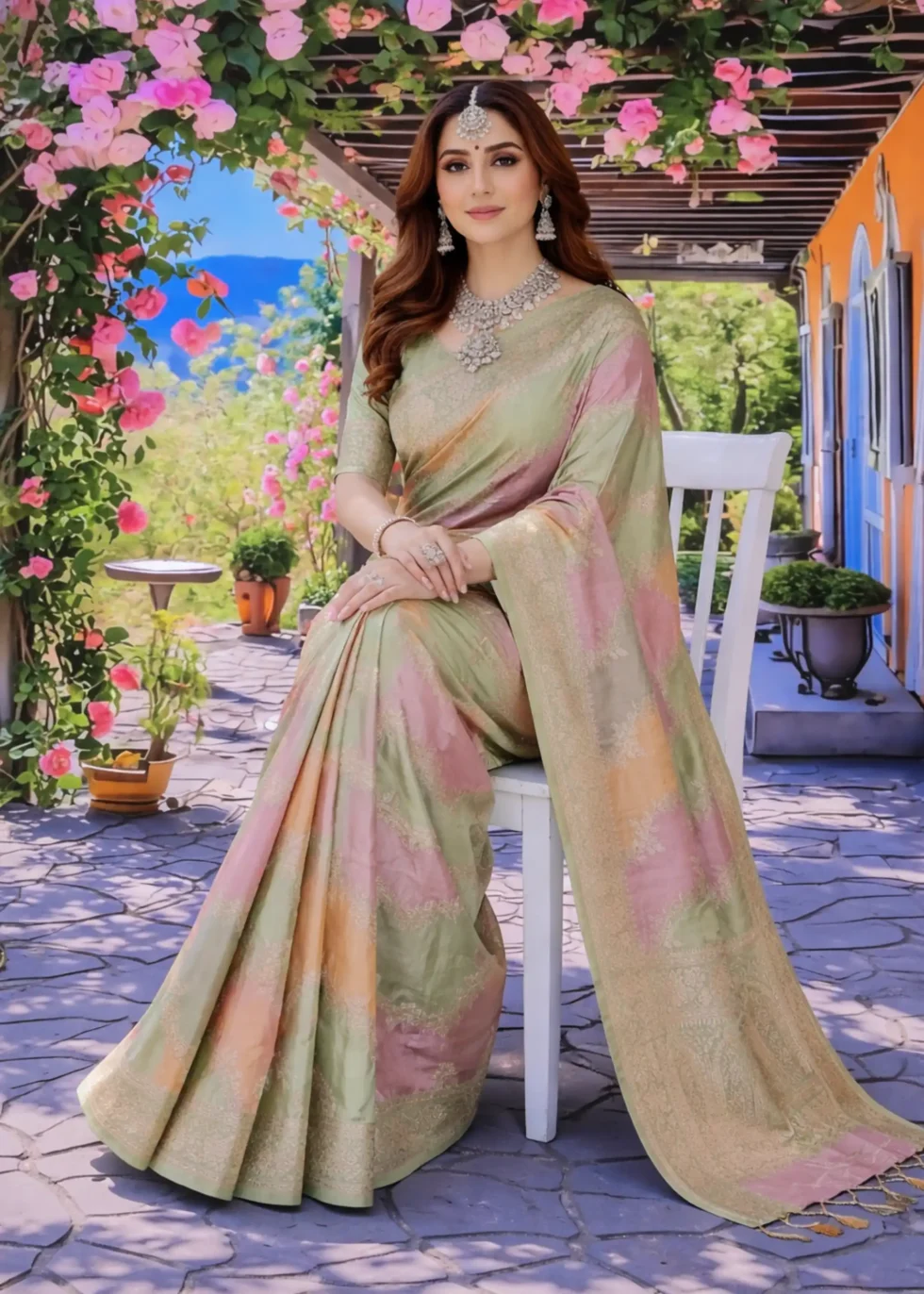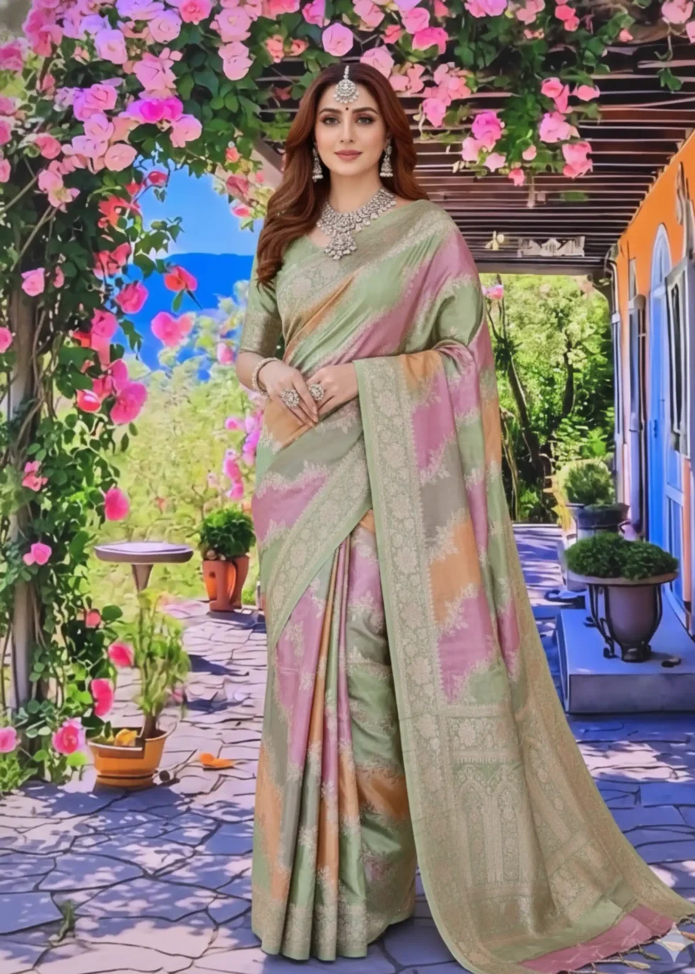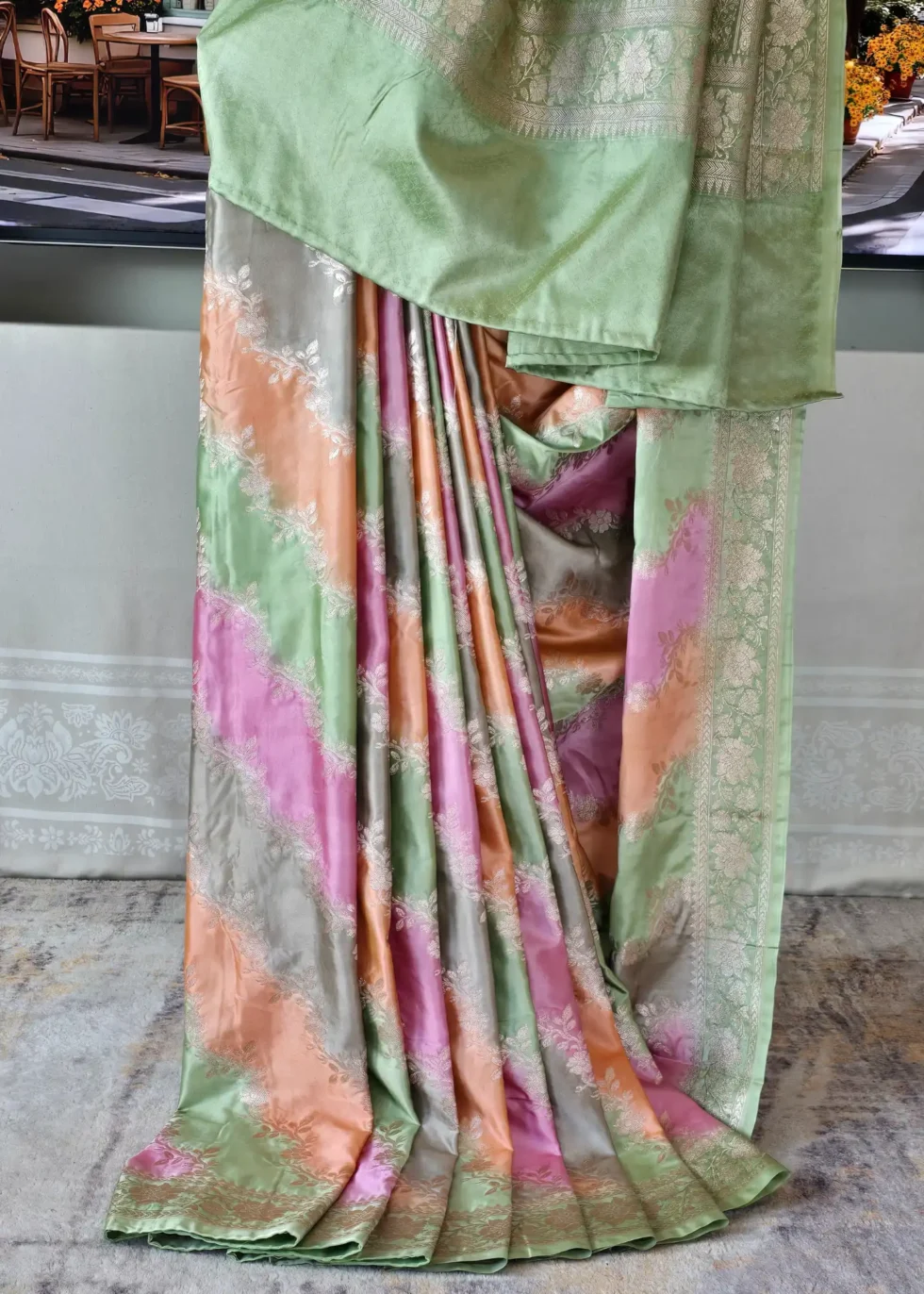 A Mashru silk Banarasi rangkatt saree in shades of pink, green, orange, grey