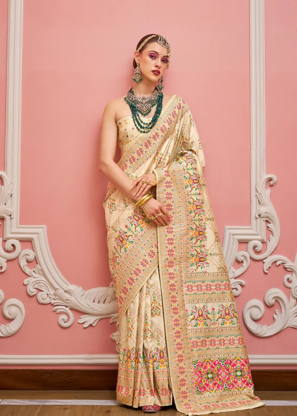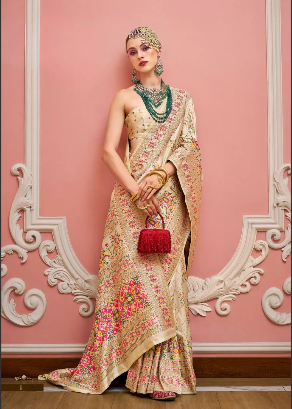 A soft silk subtle cream saree with multicoloured threadwork embellishment