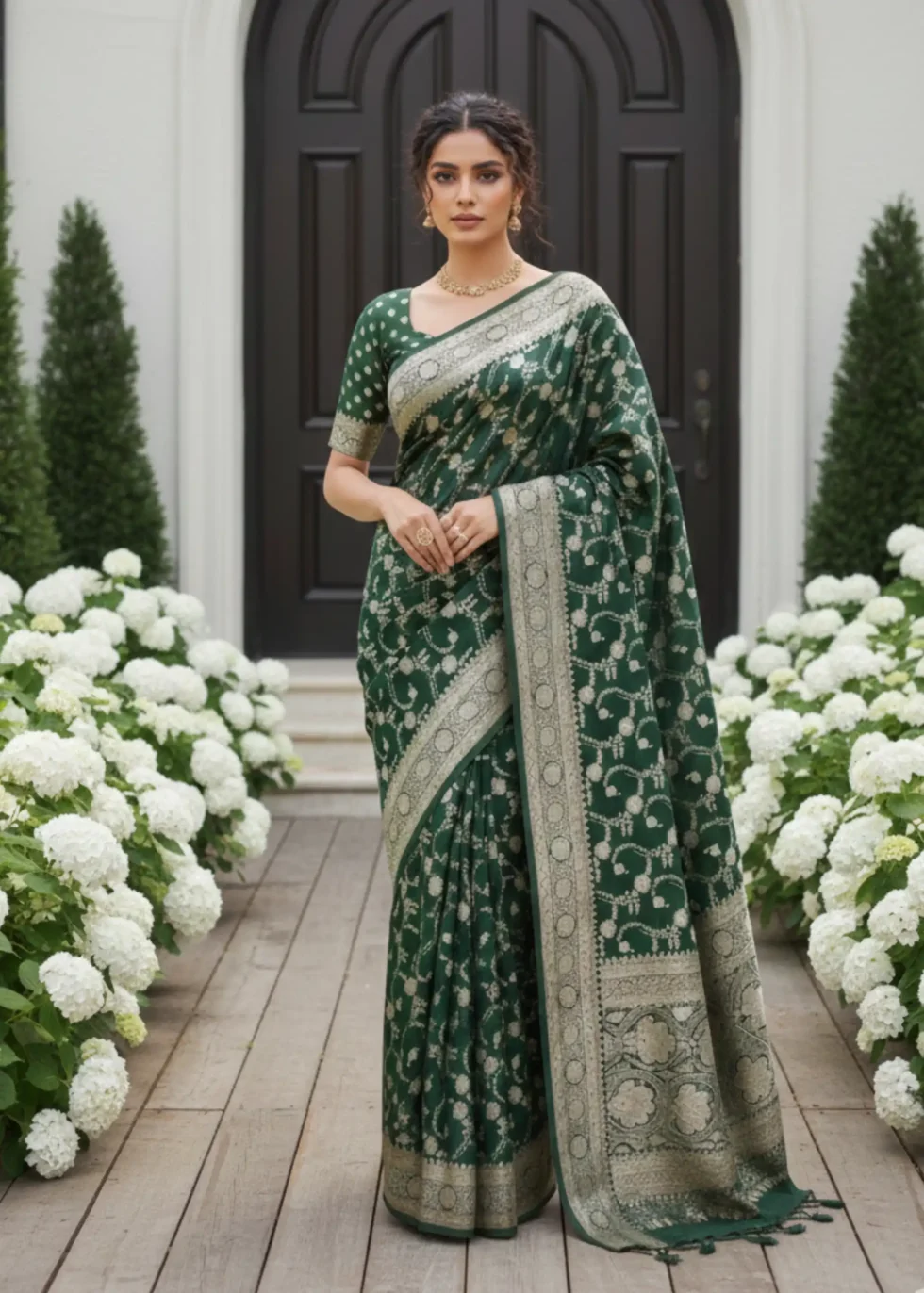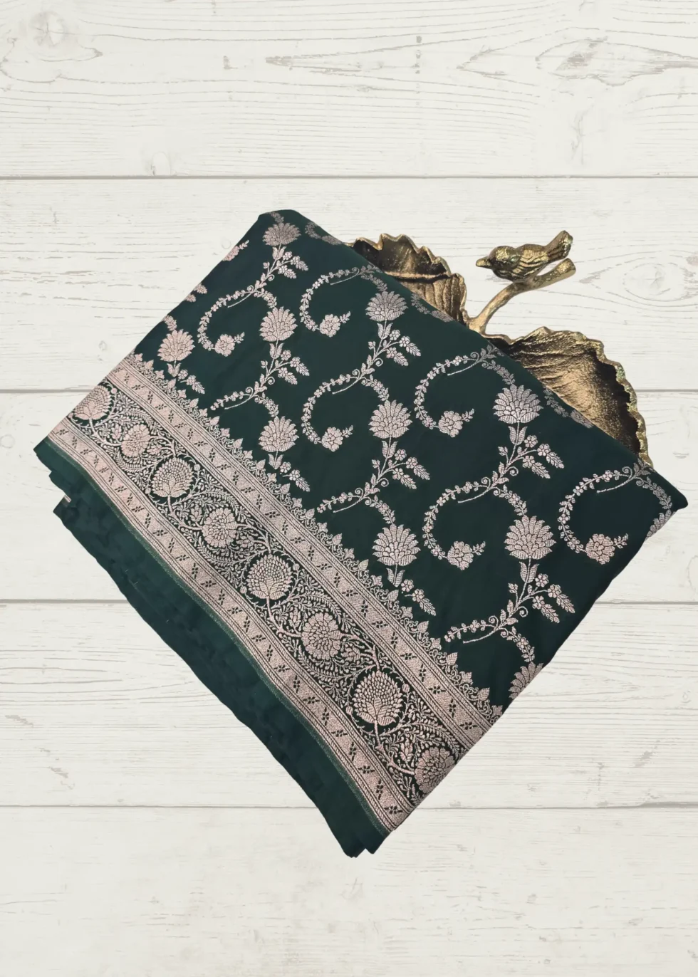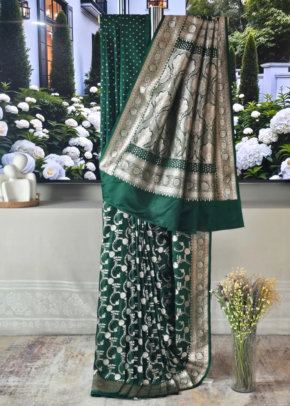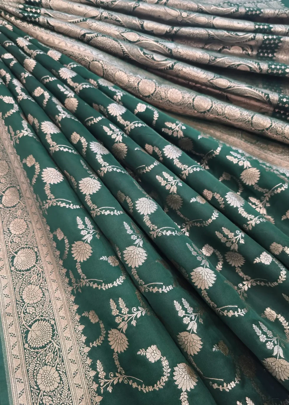 A forest green Banarasi saree in Mashru silk with overall subtle gold jaal design
