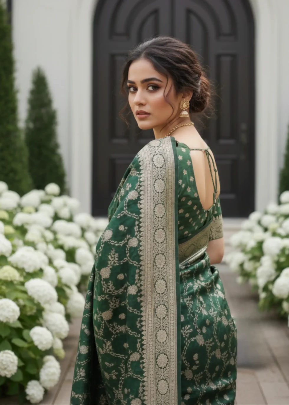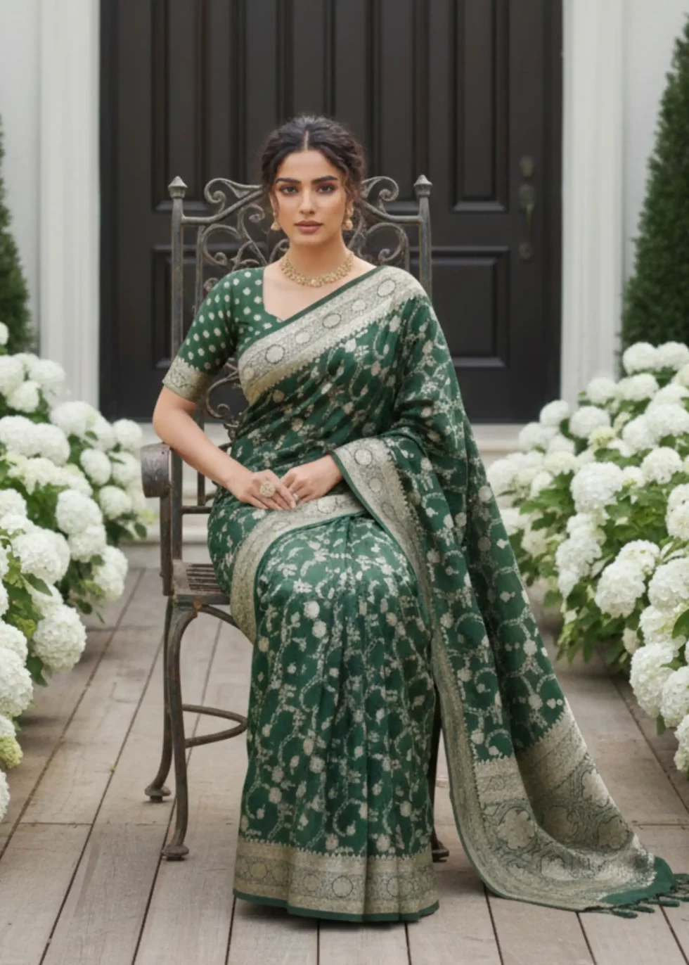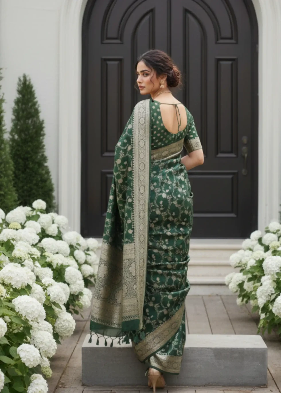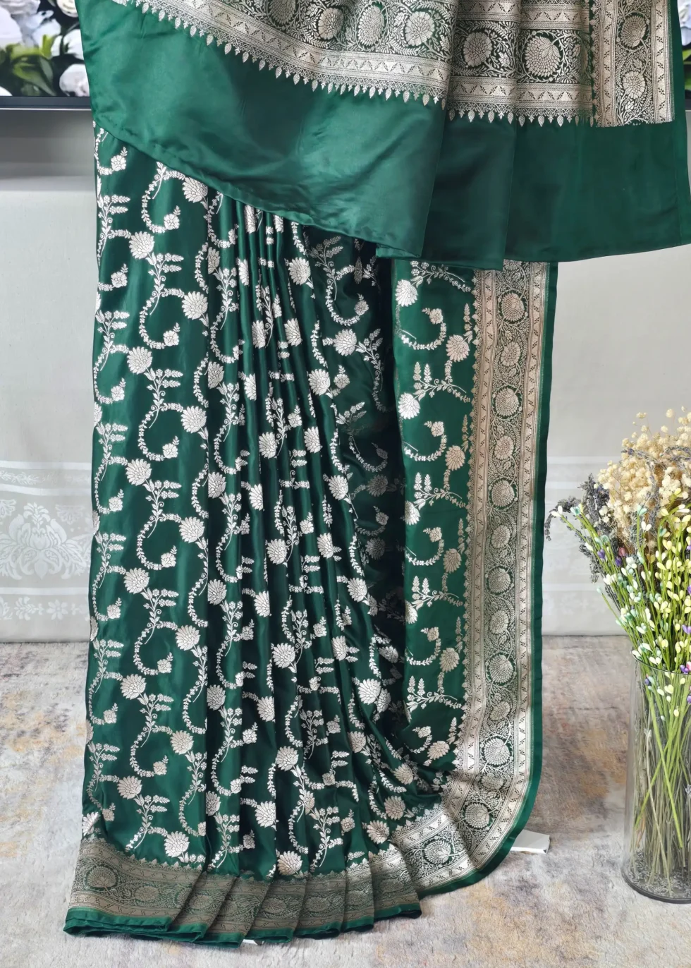 A forest green Banarasi saree in Mashru silk with overall subtle gold jaal design