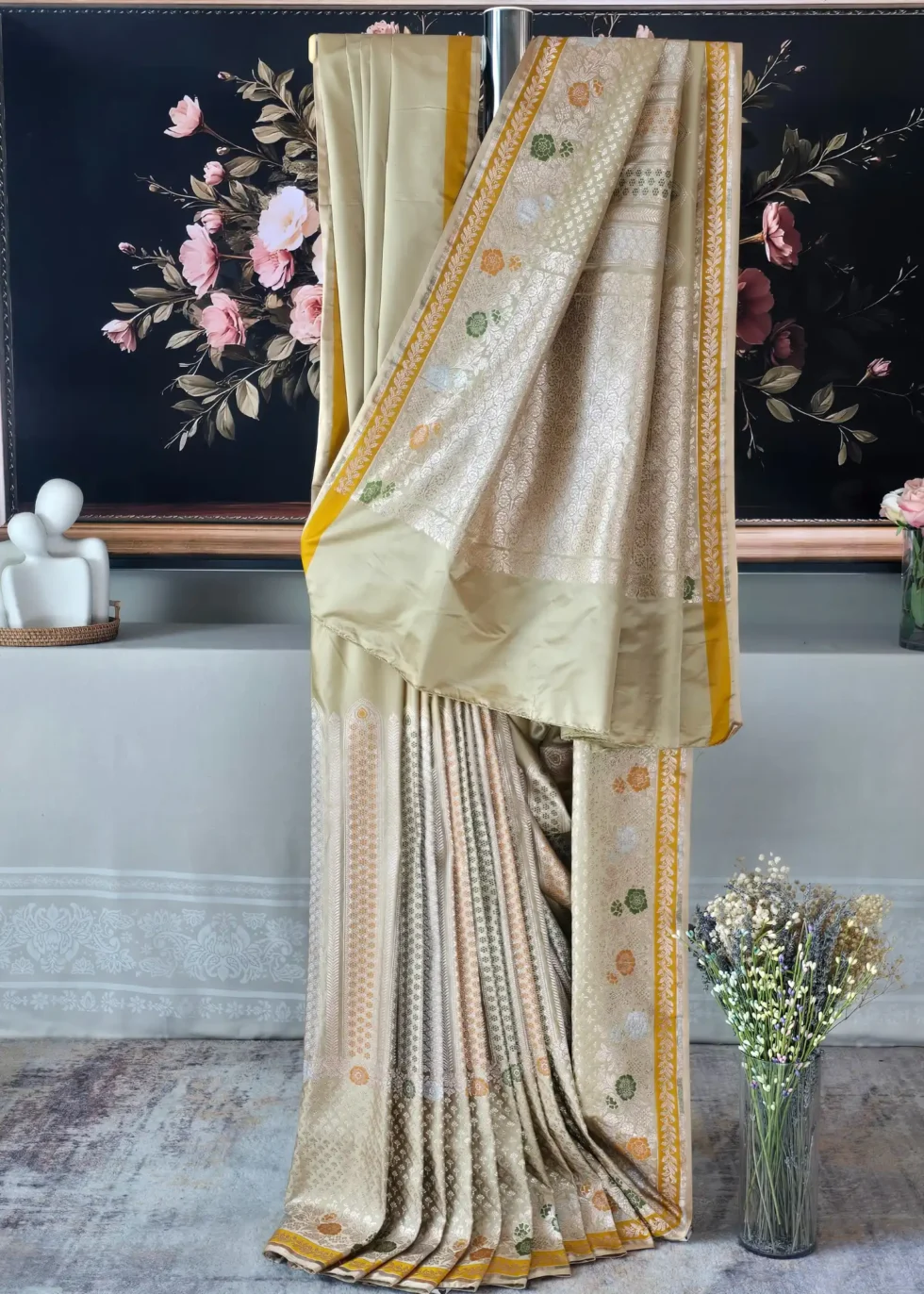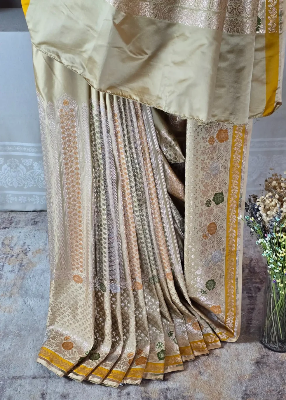 A pastel gold Banarasi saree in Mashru silk with unique vertical pattern