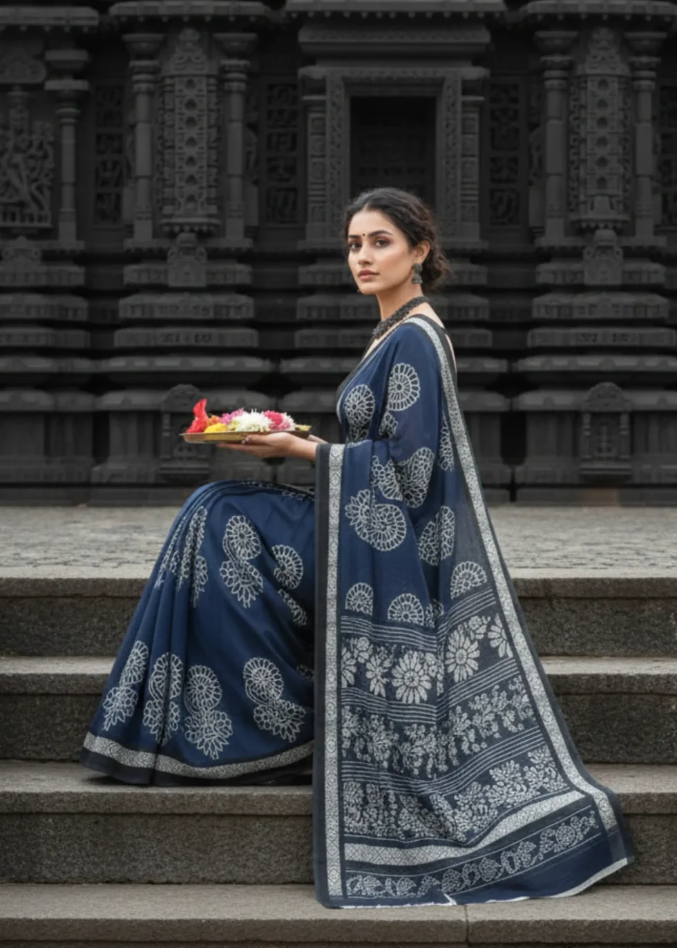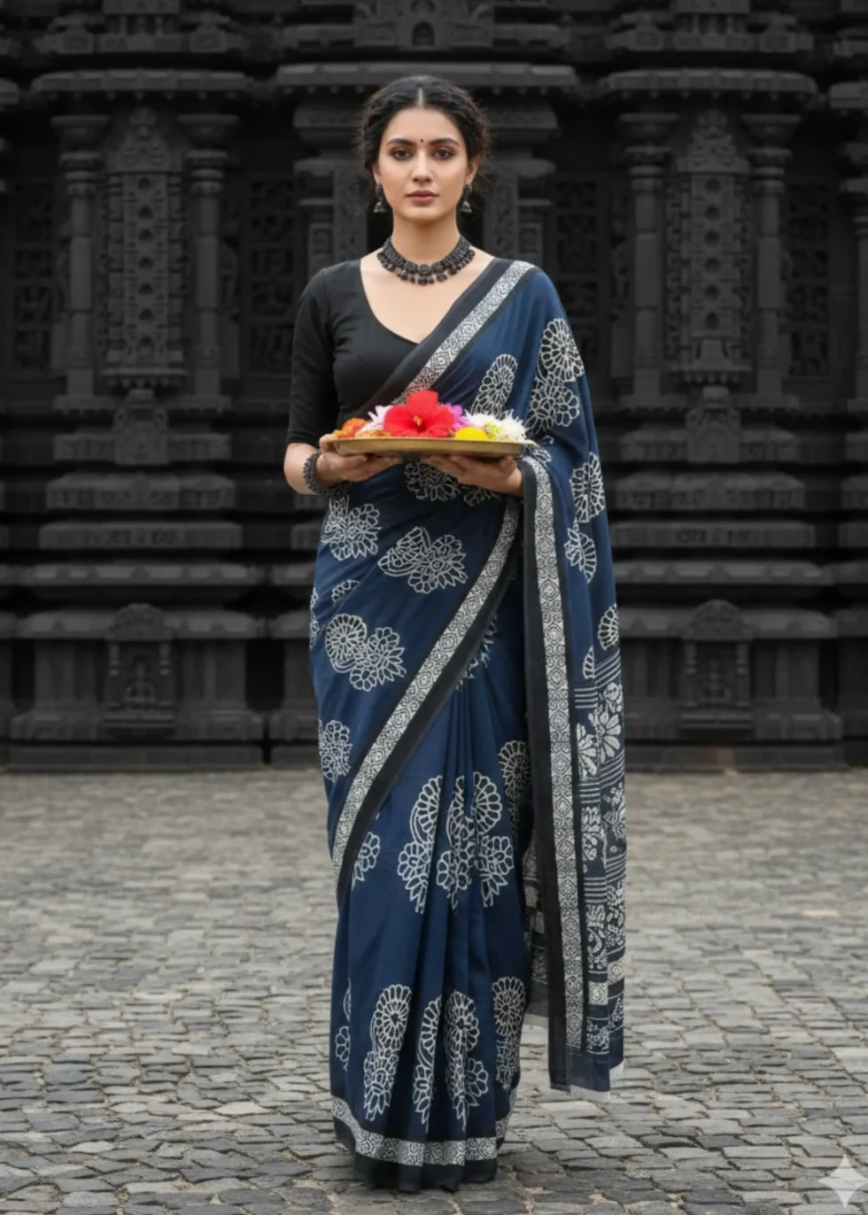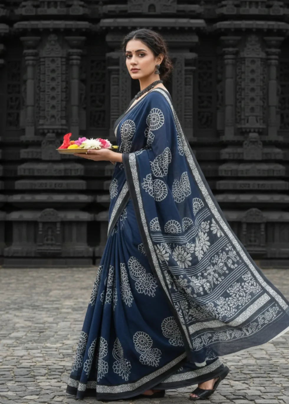 A soft cotton saree in indigo blue with white motif printing. A good option as a casual-wear.