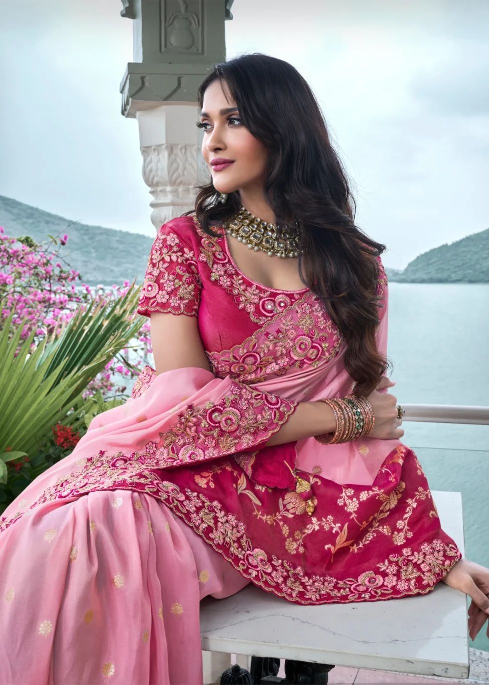 Light and dark pink tissue organza saree with embroidered embellishment
