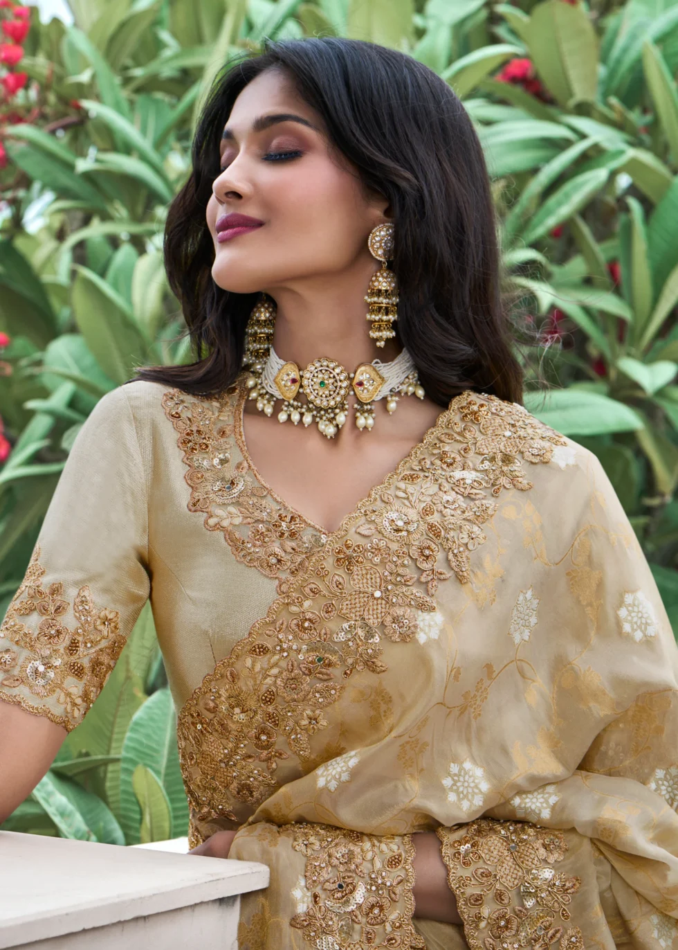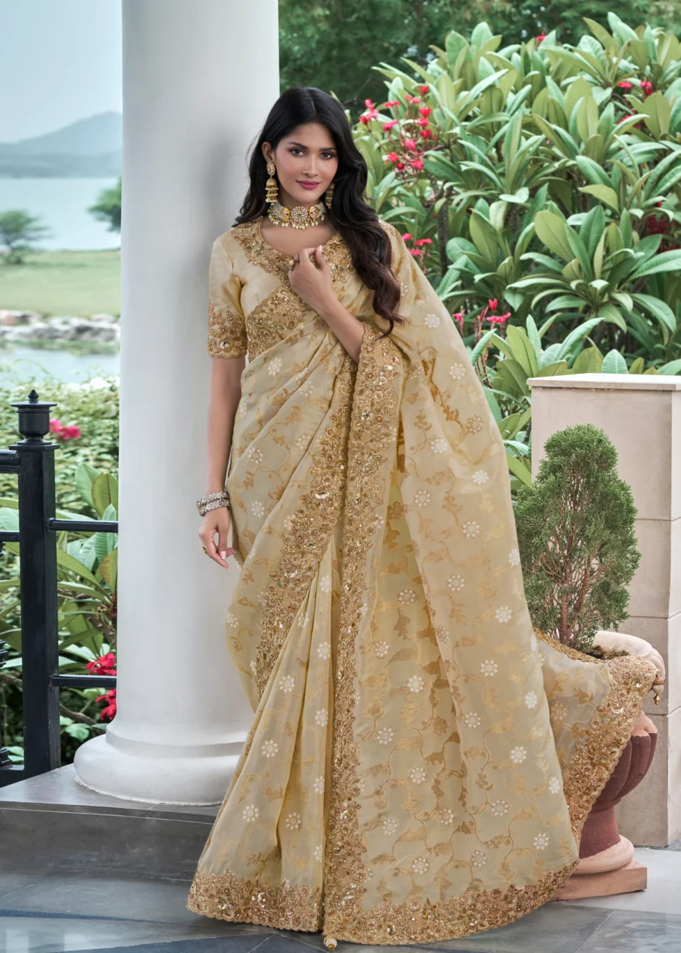 A cream gold saree in light organza with accented embroidered borders and designer blouse
