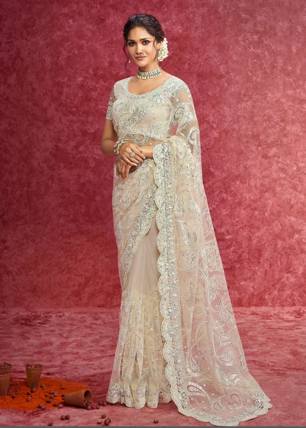 A lightweight white saree with sequinsed embellishment all over with a designer blouse