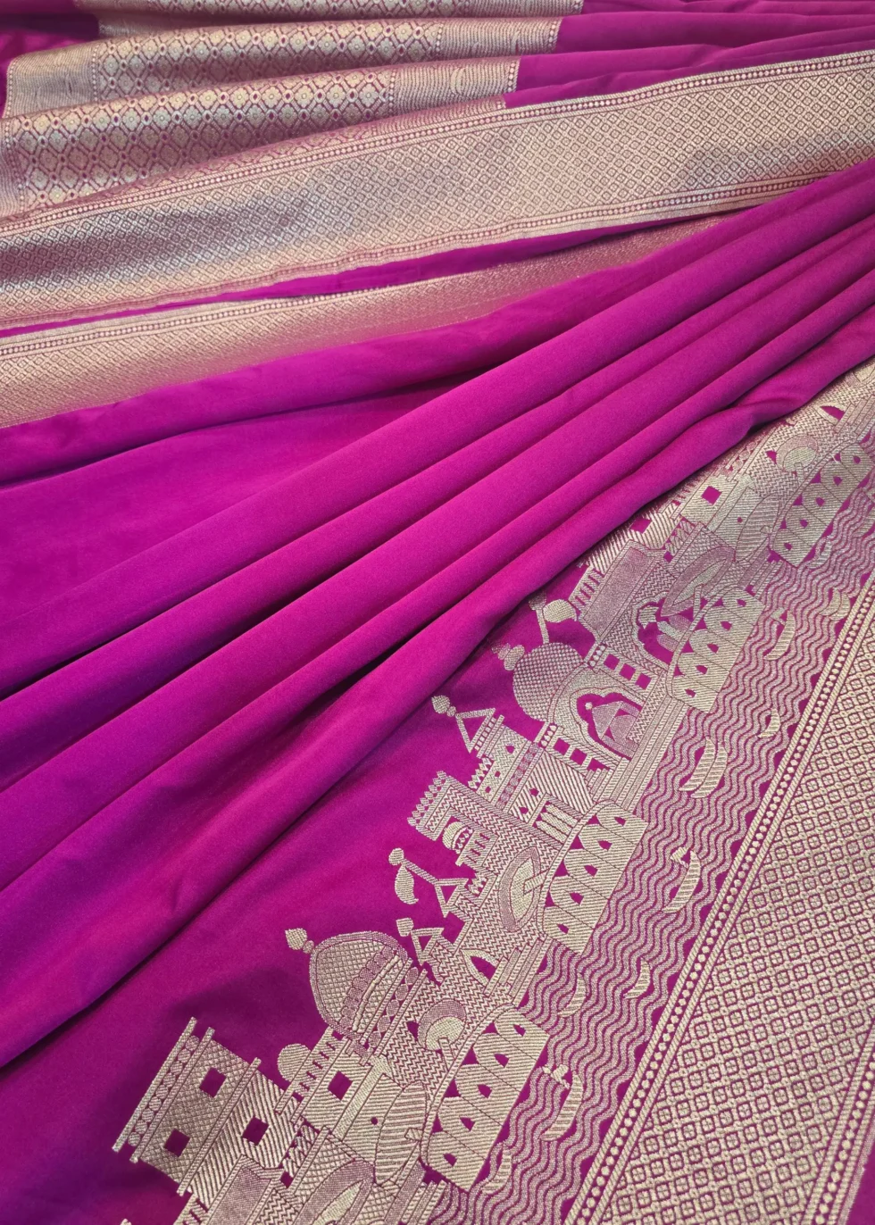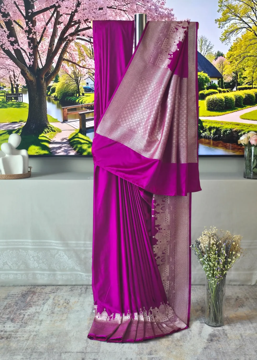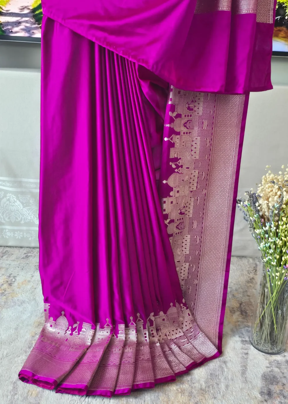 A rani pink Banarasi in Mashru silk with the heritage Banaras ghat border