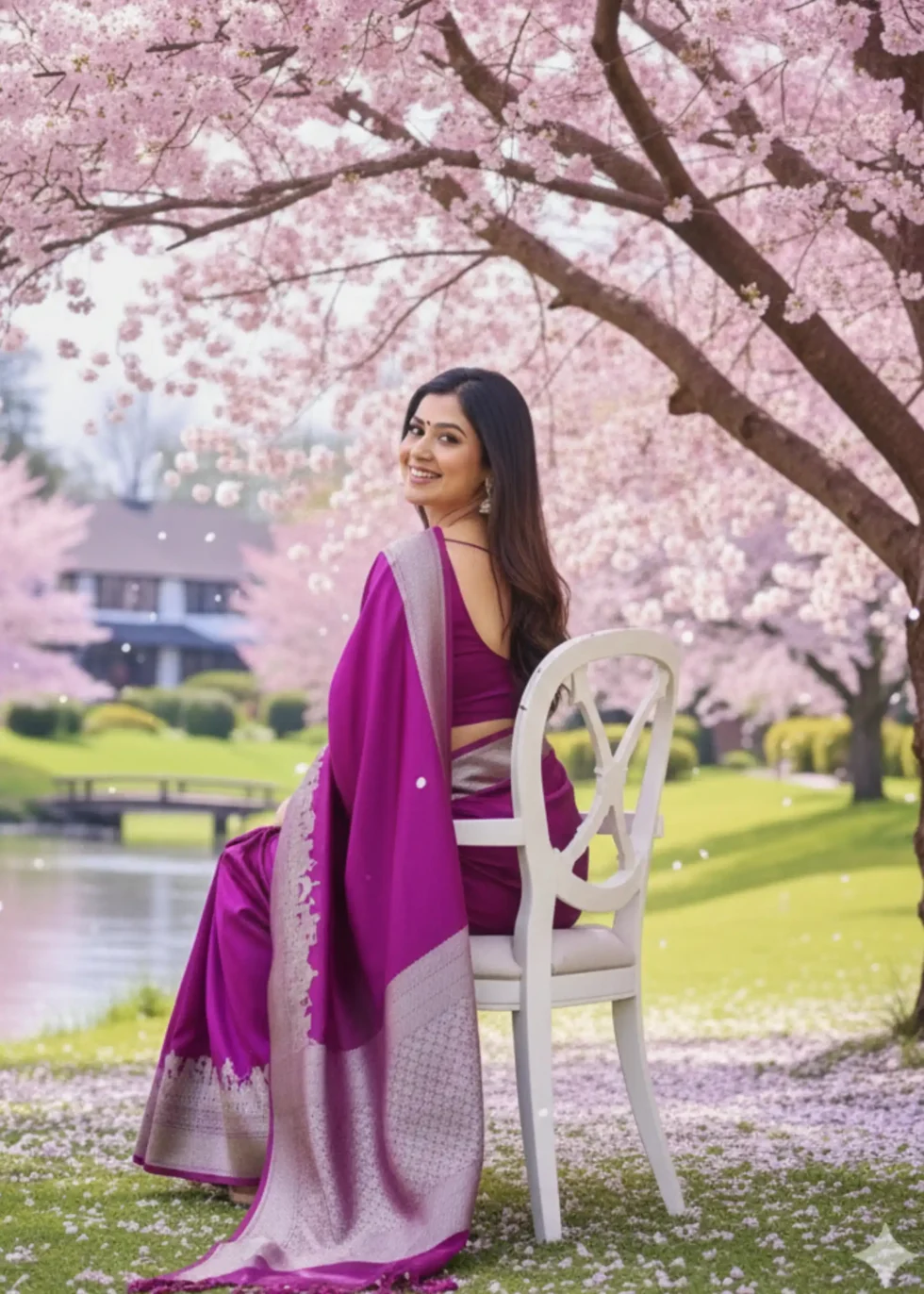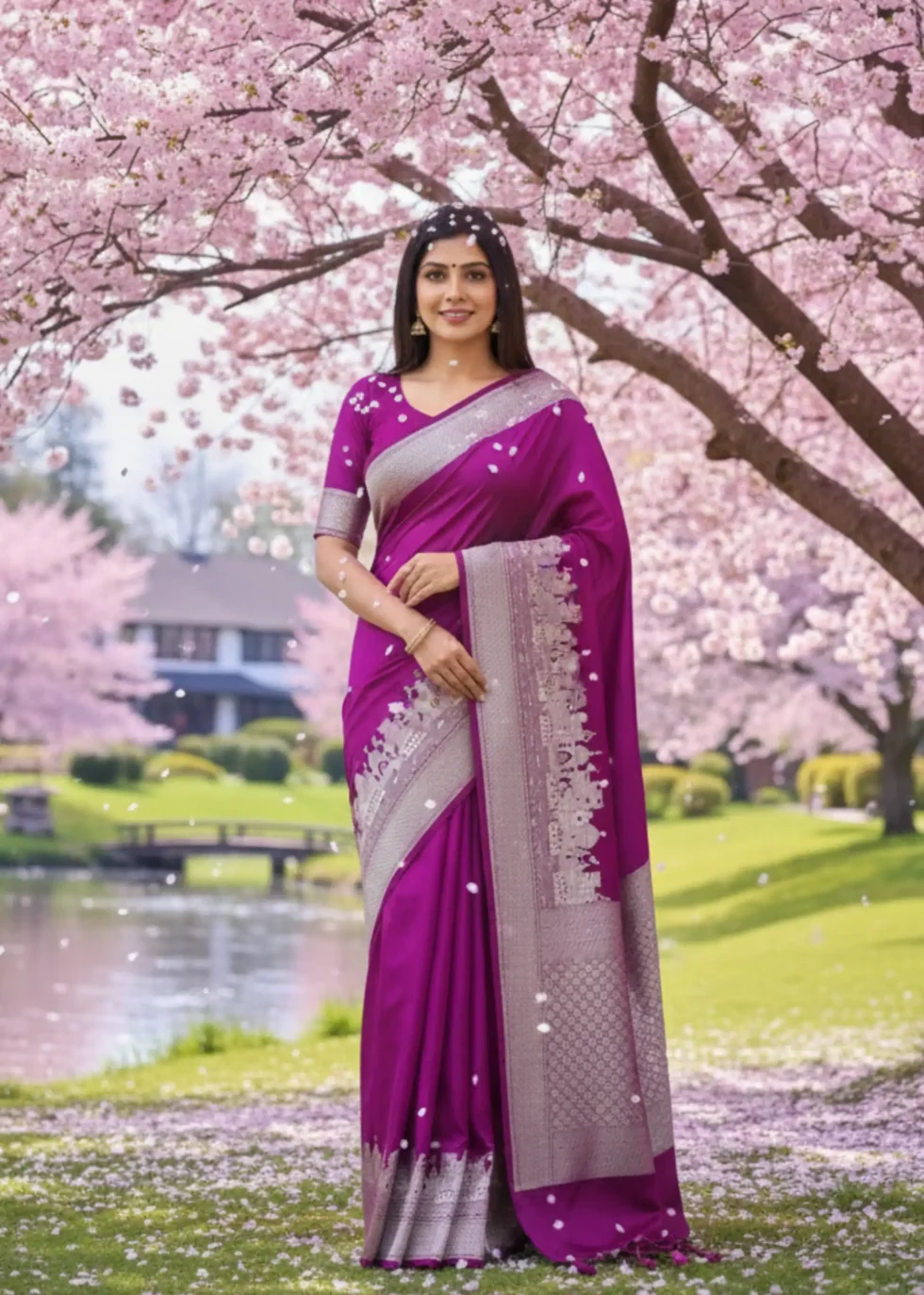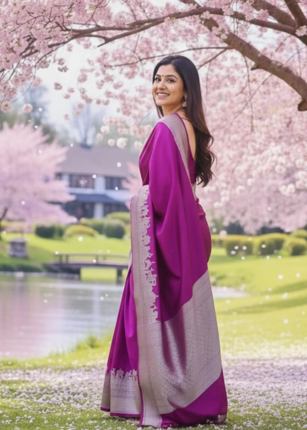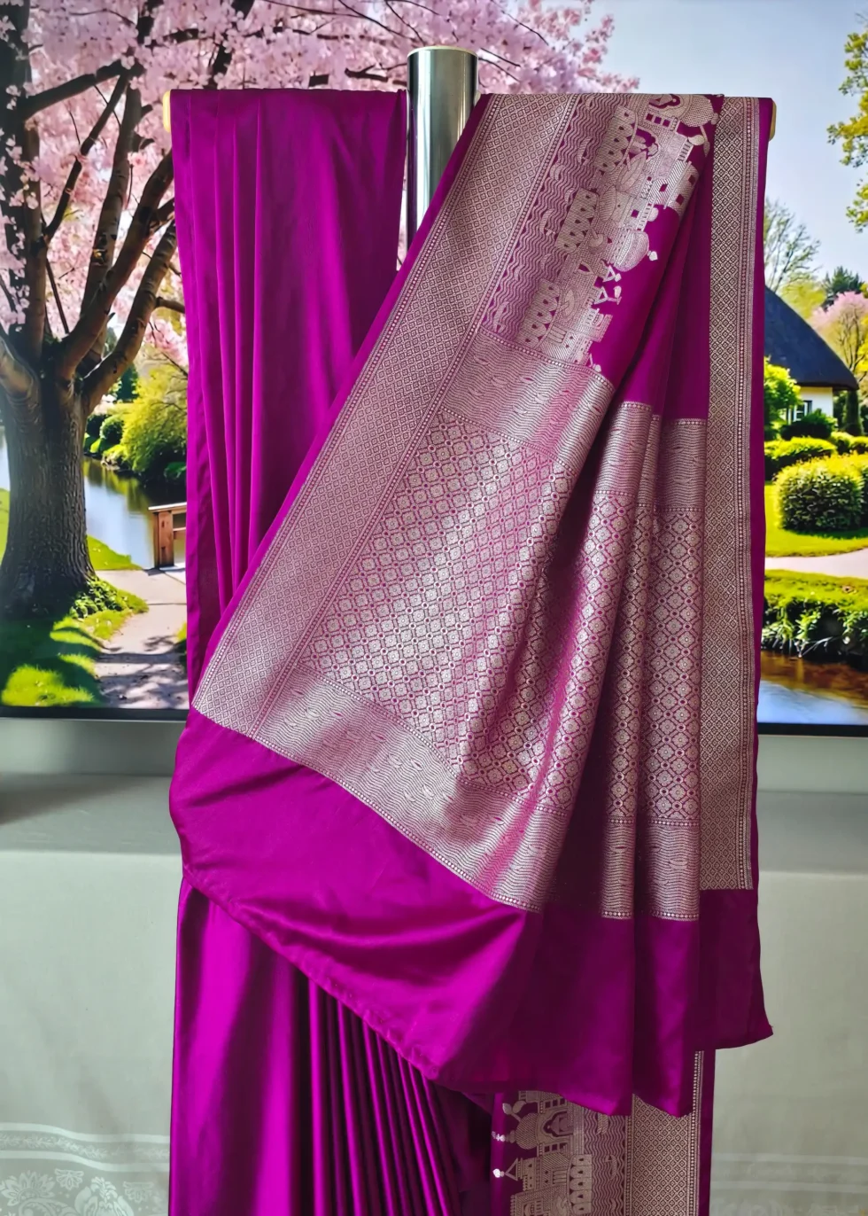 A rani pink Banarasi in Mashru silk with the heritage Banaras ghat border