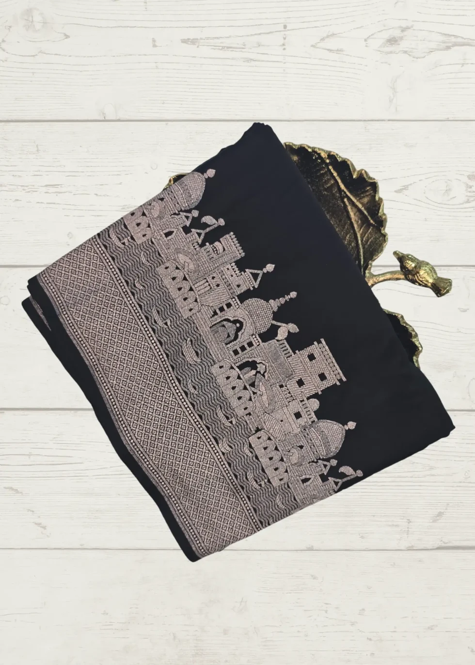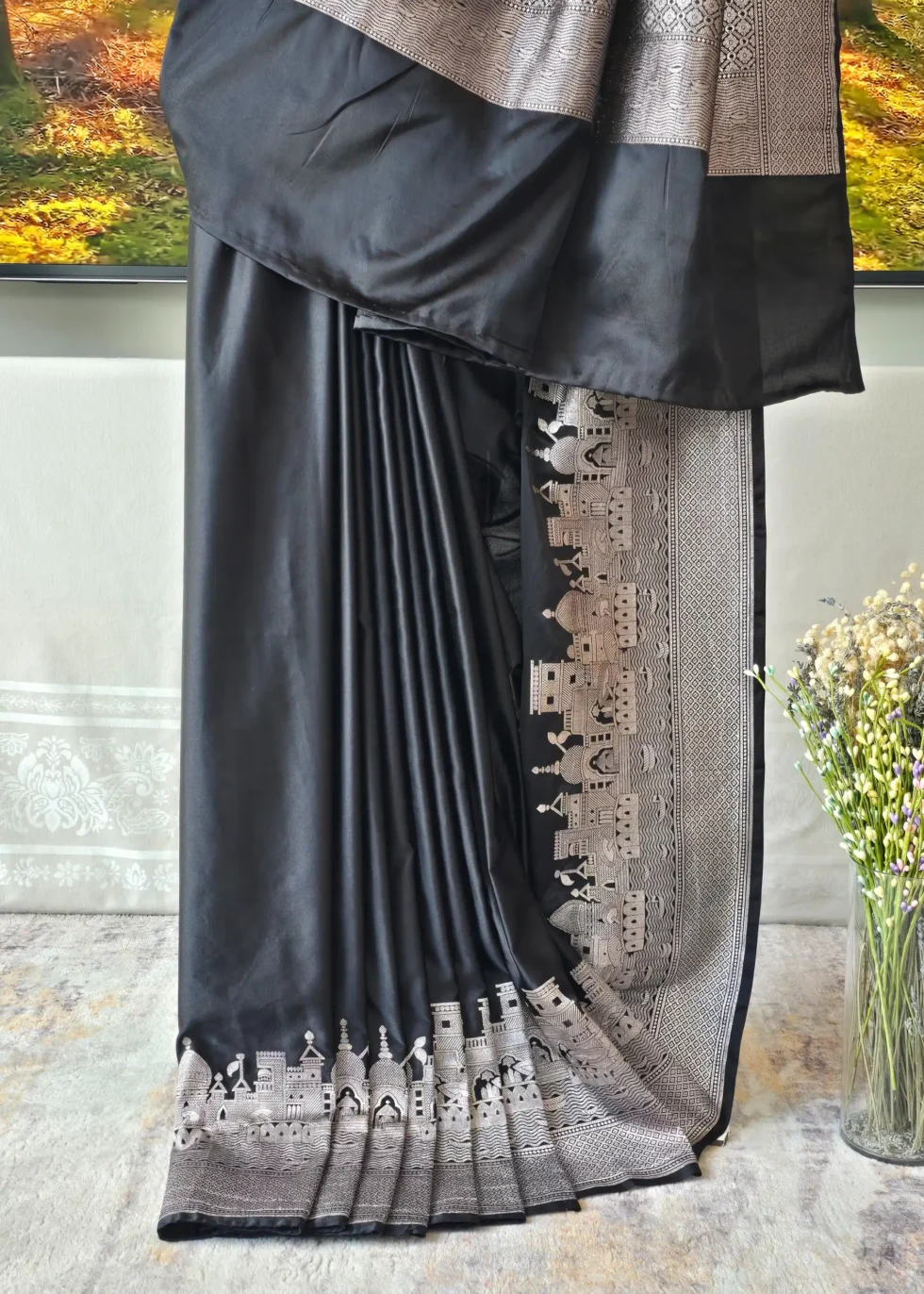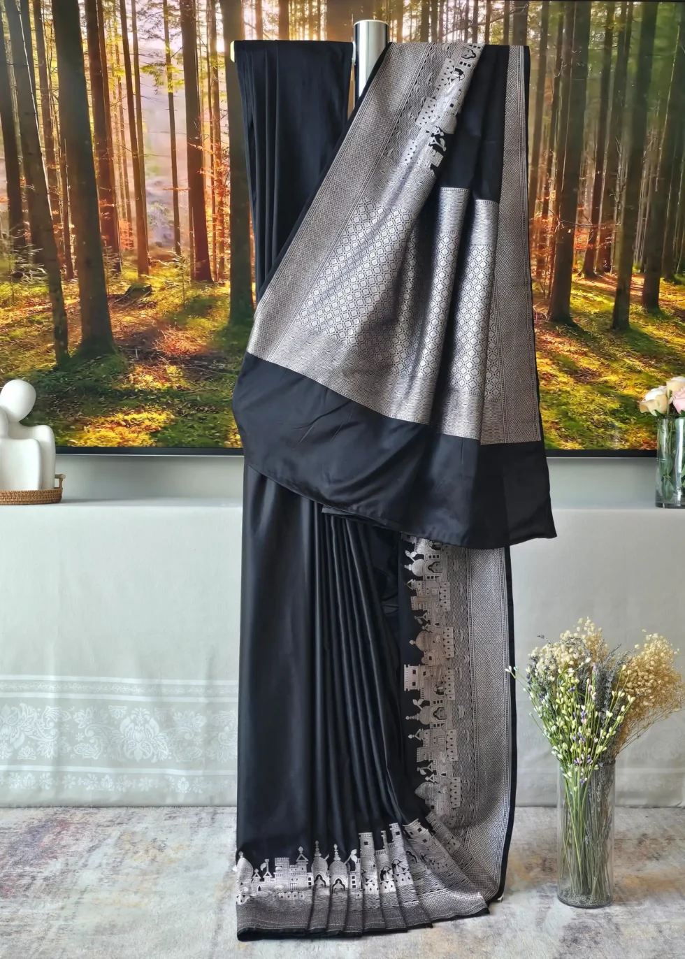 A charcoal black soft mashru silk Banarasi saree with Ganga Ghat border in silver zari weave