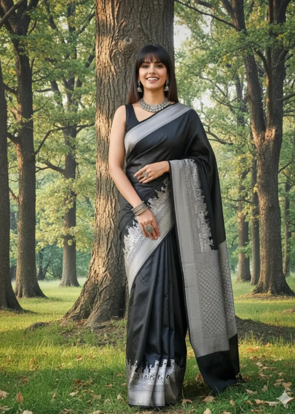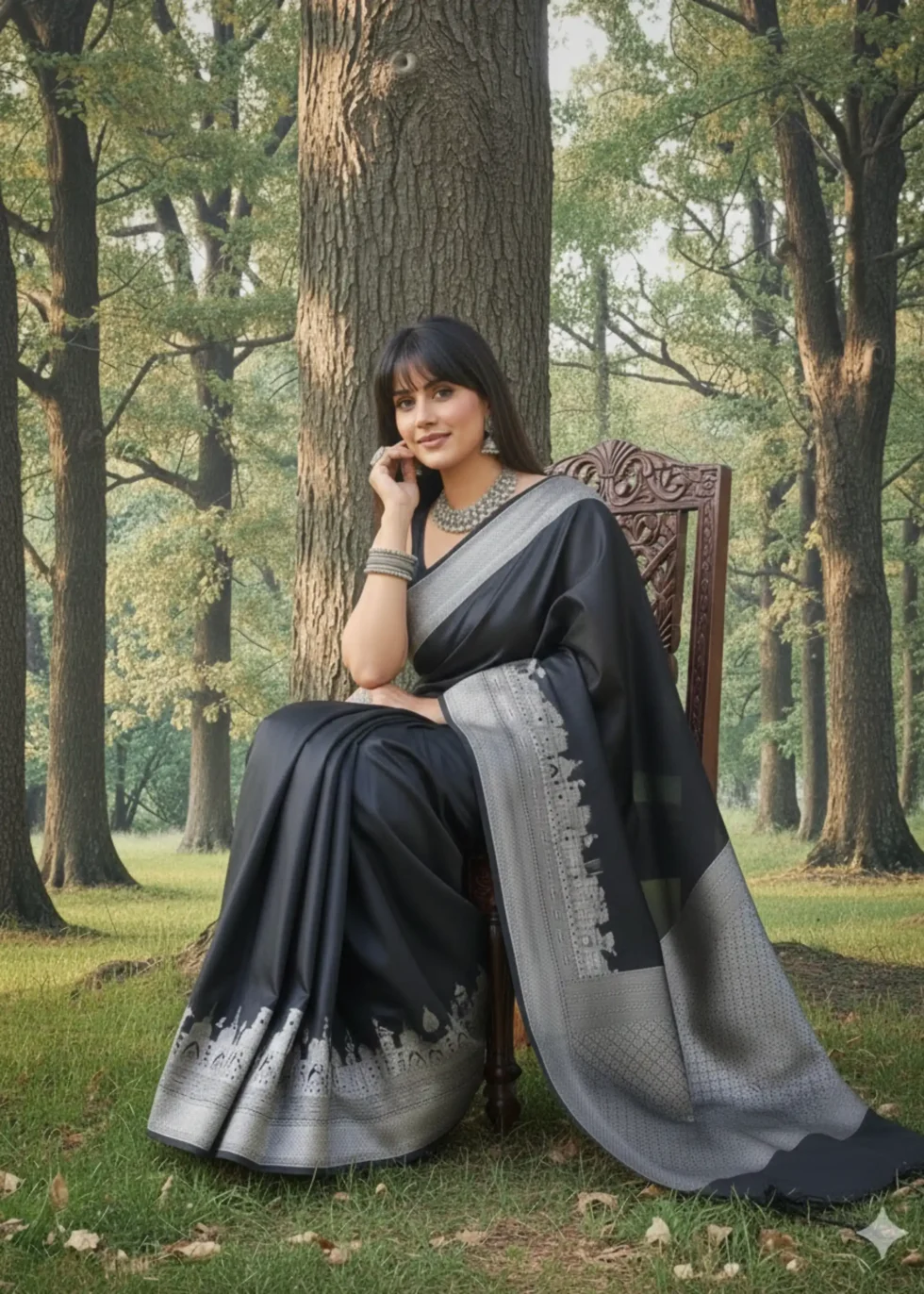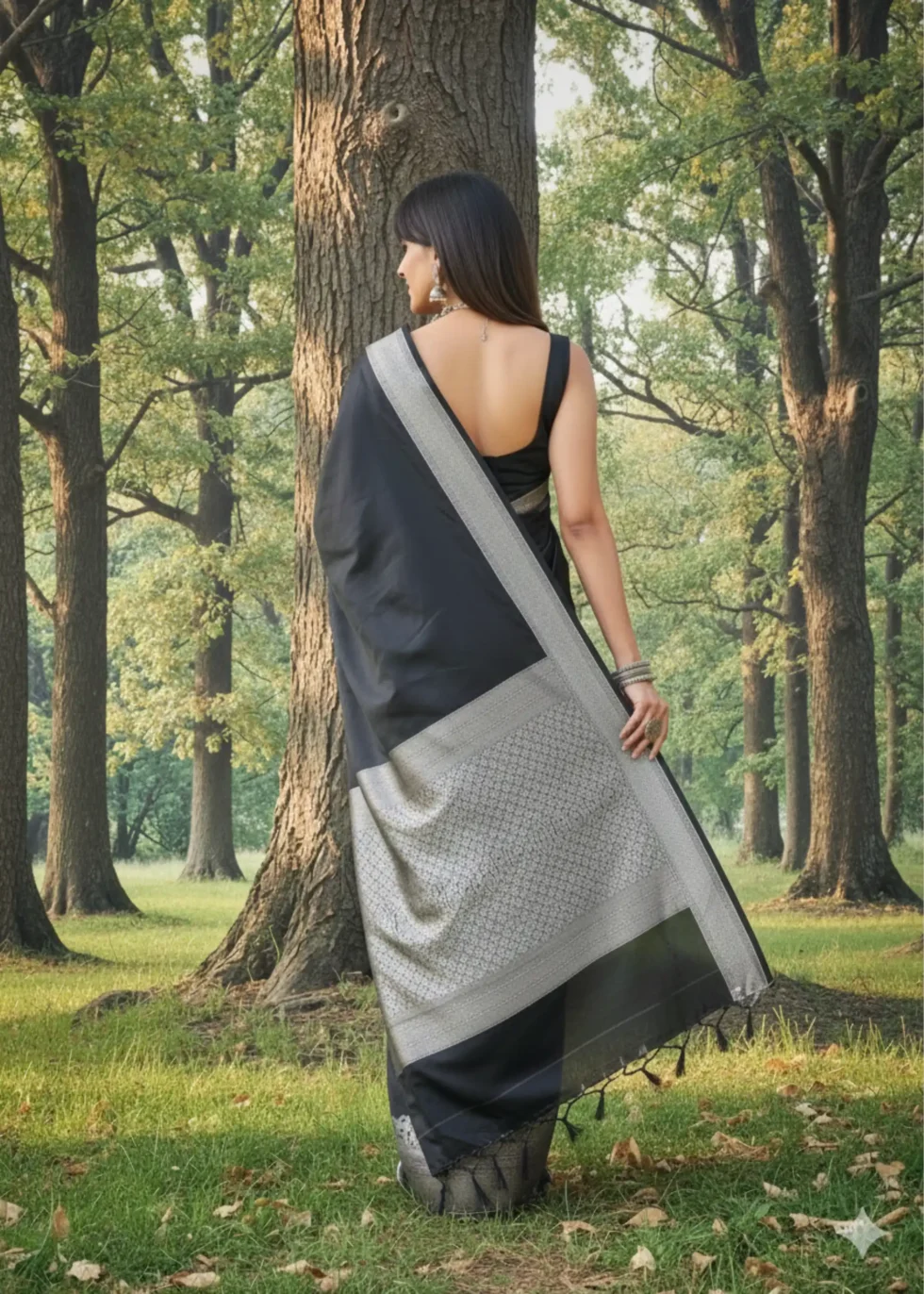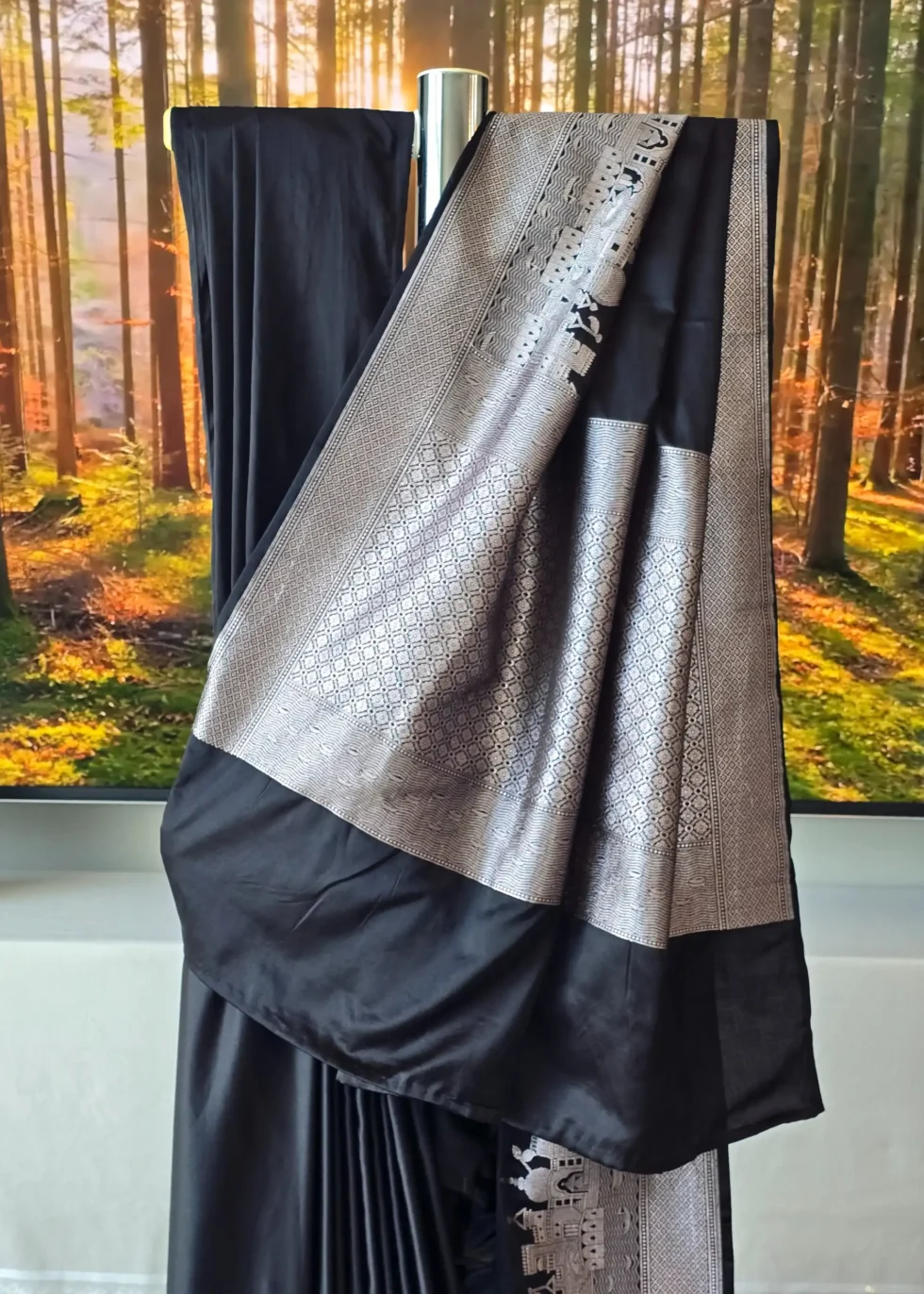 A charcoal black soft mashru silk Banarasi saree with Ganga Ghat border in silver zari weave
