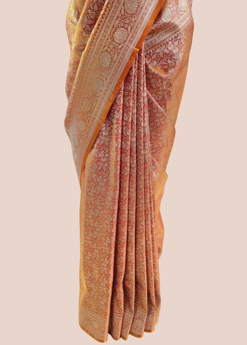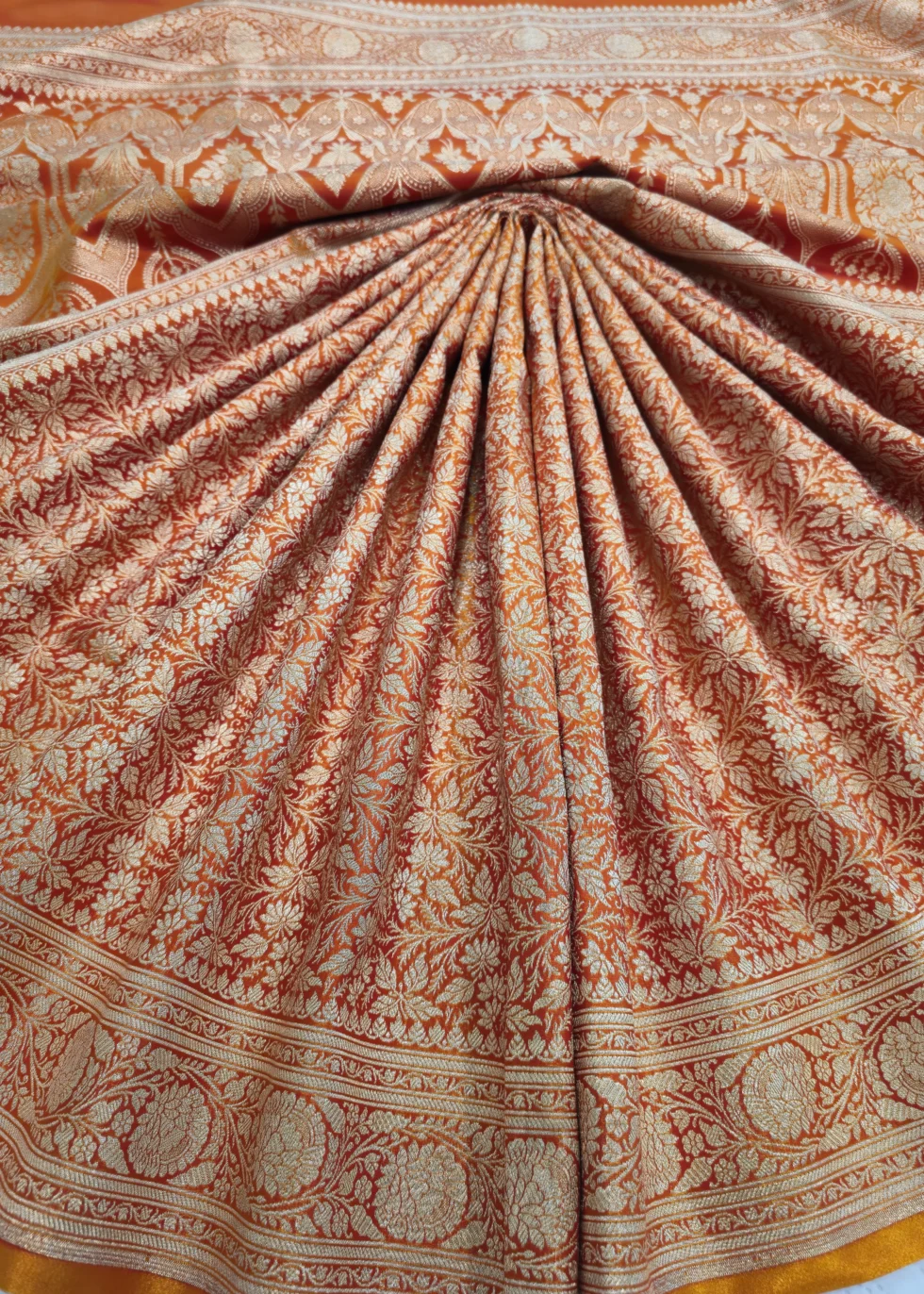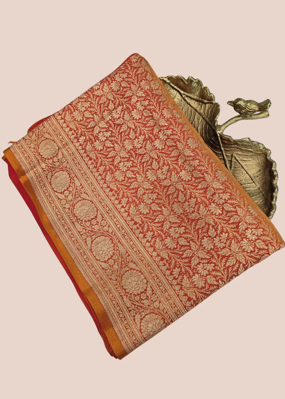 A bright orange Banarasi saree with dense gold weaving for special occasions