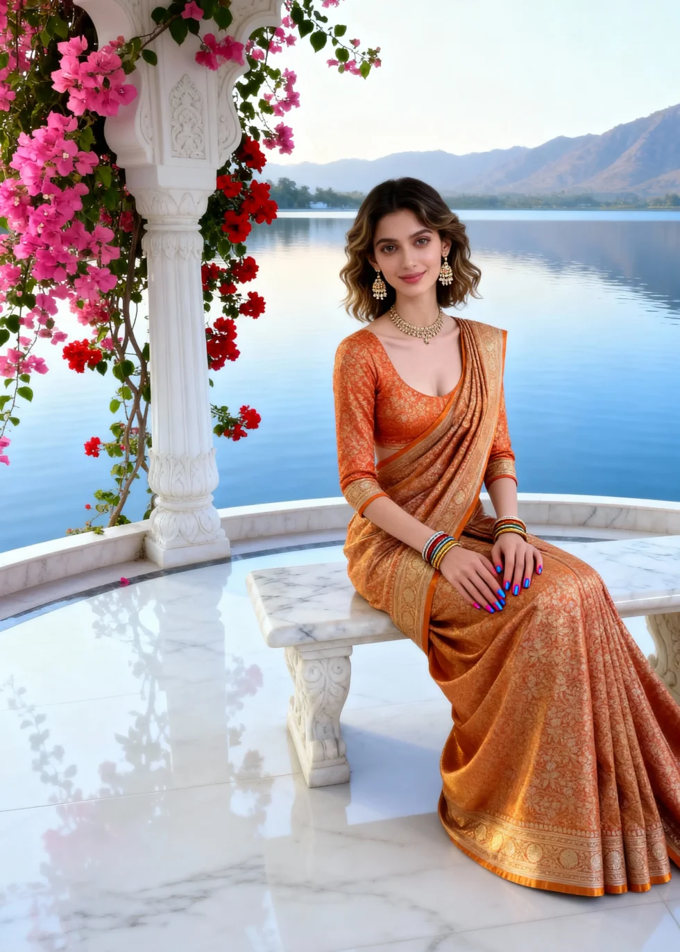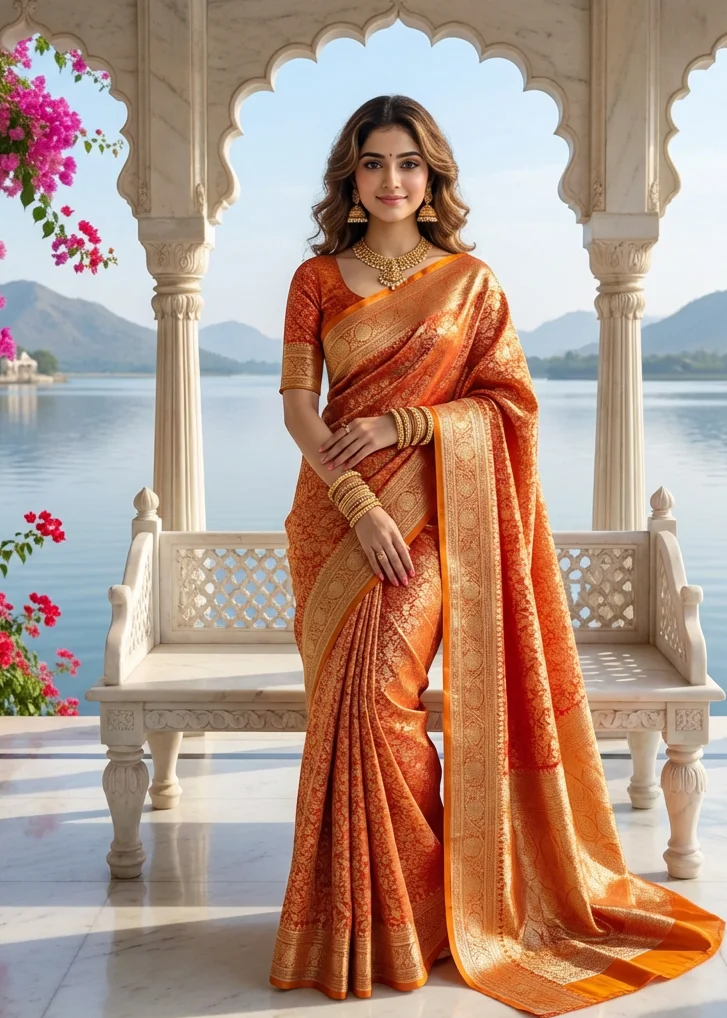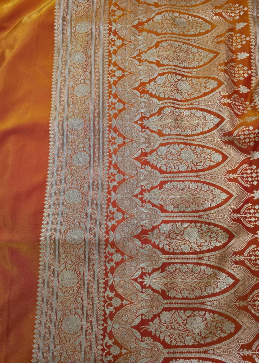 A bright orange Banarasi saree with dense gold weaving for special occasions