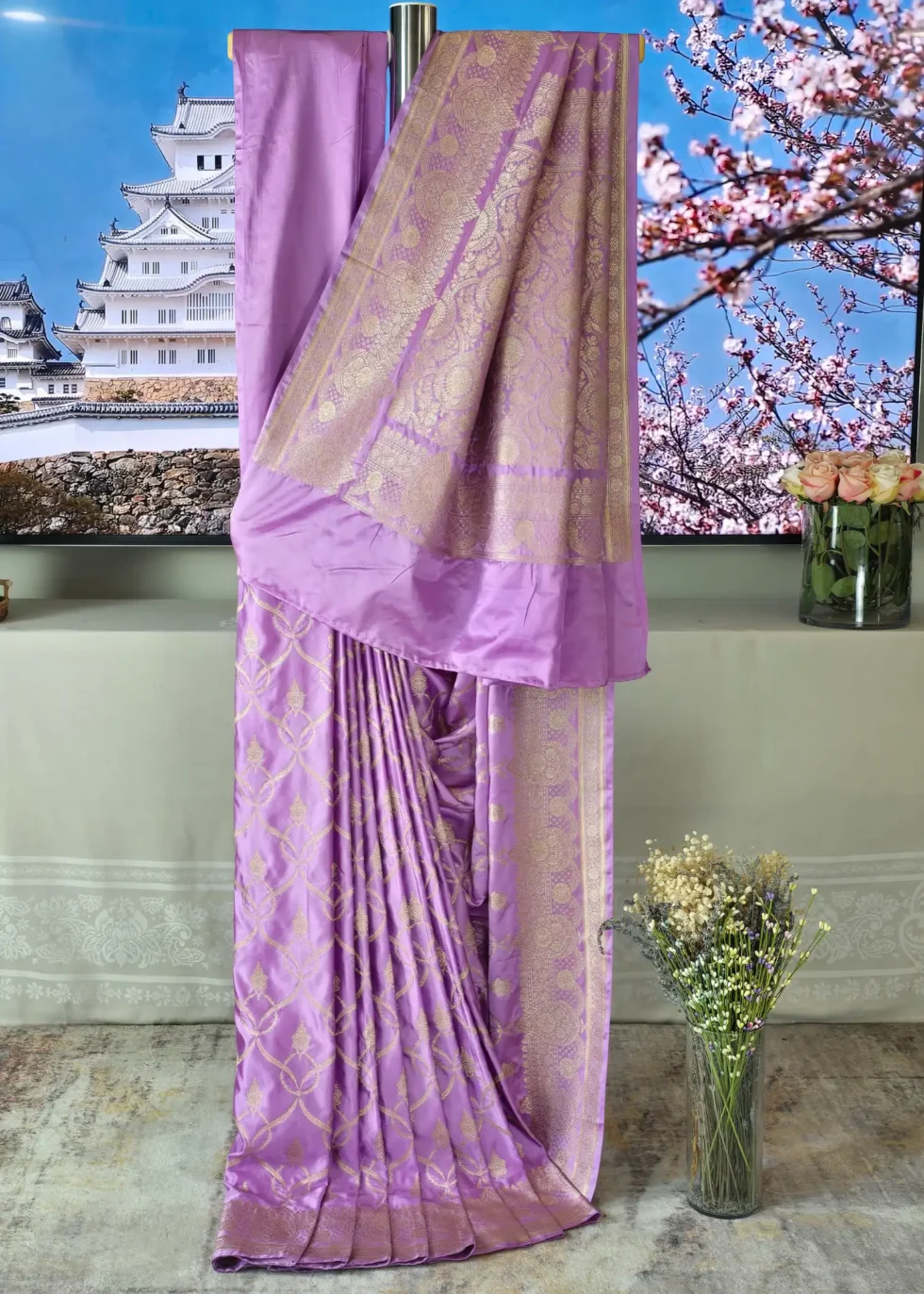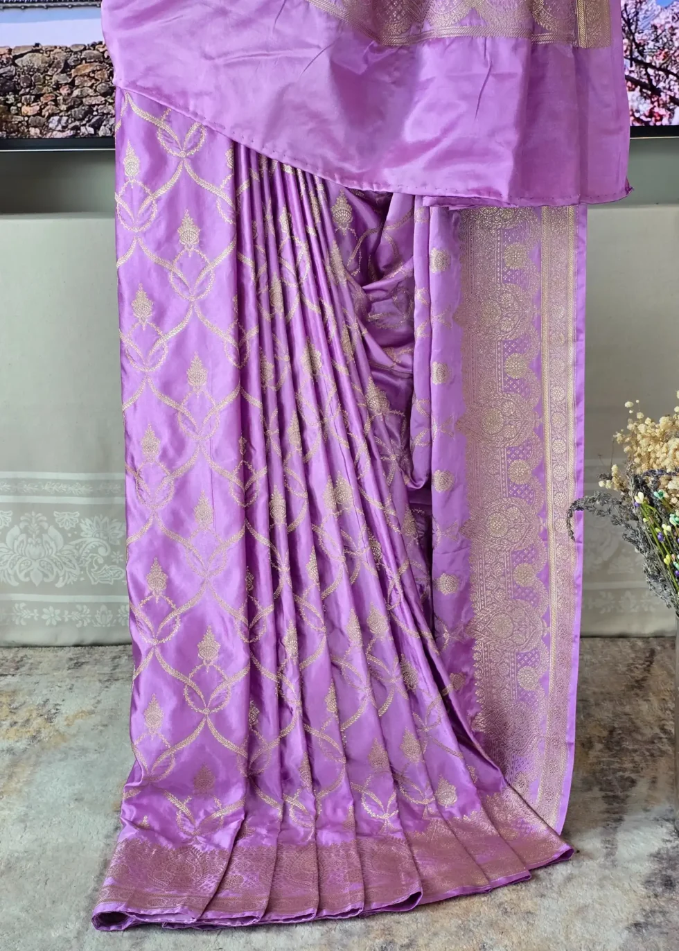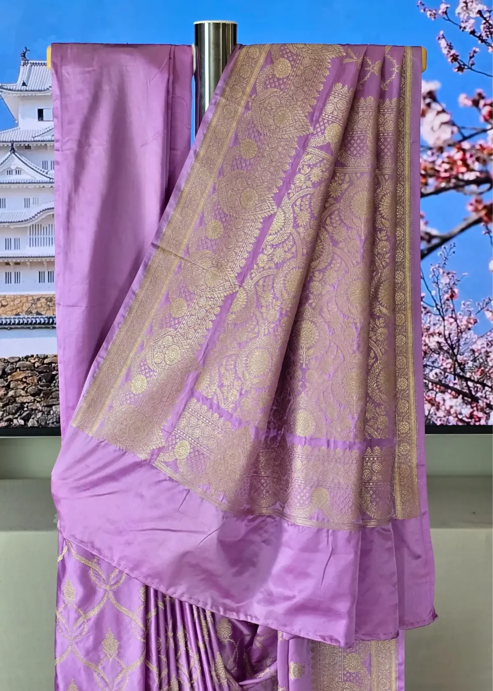 A lavender mashru silk Banarasi saree with gold jaal weaving