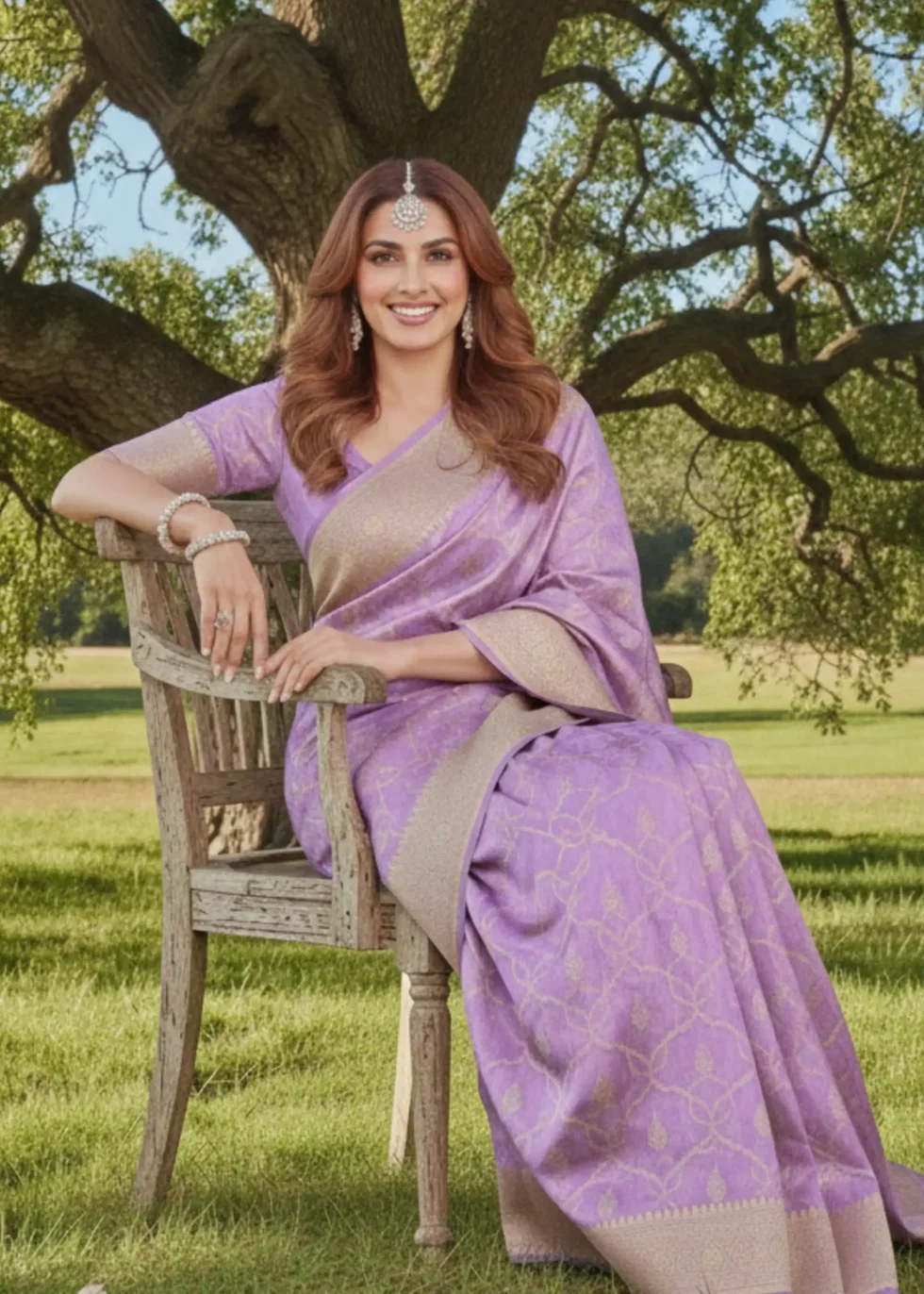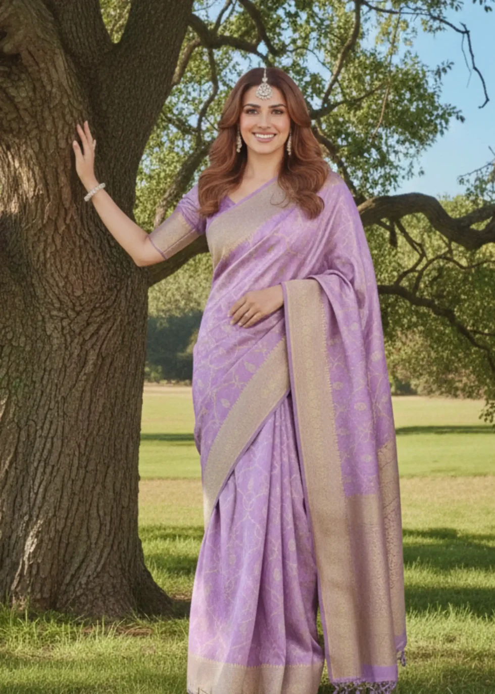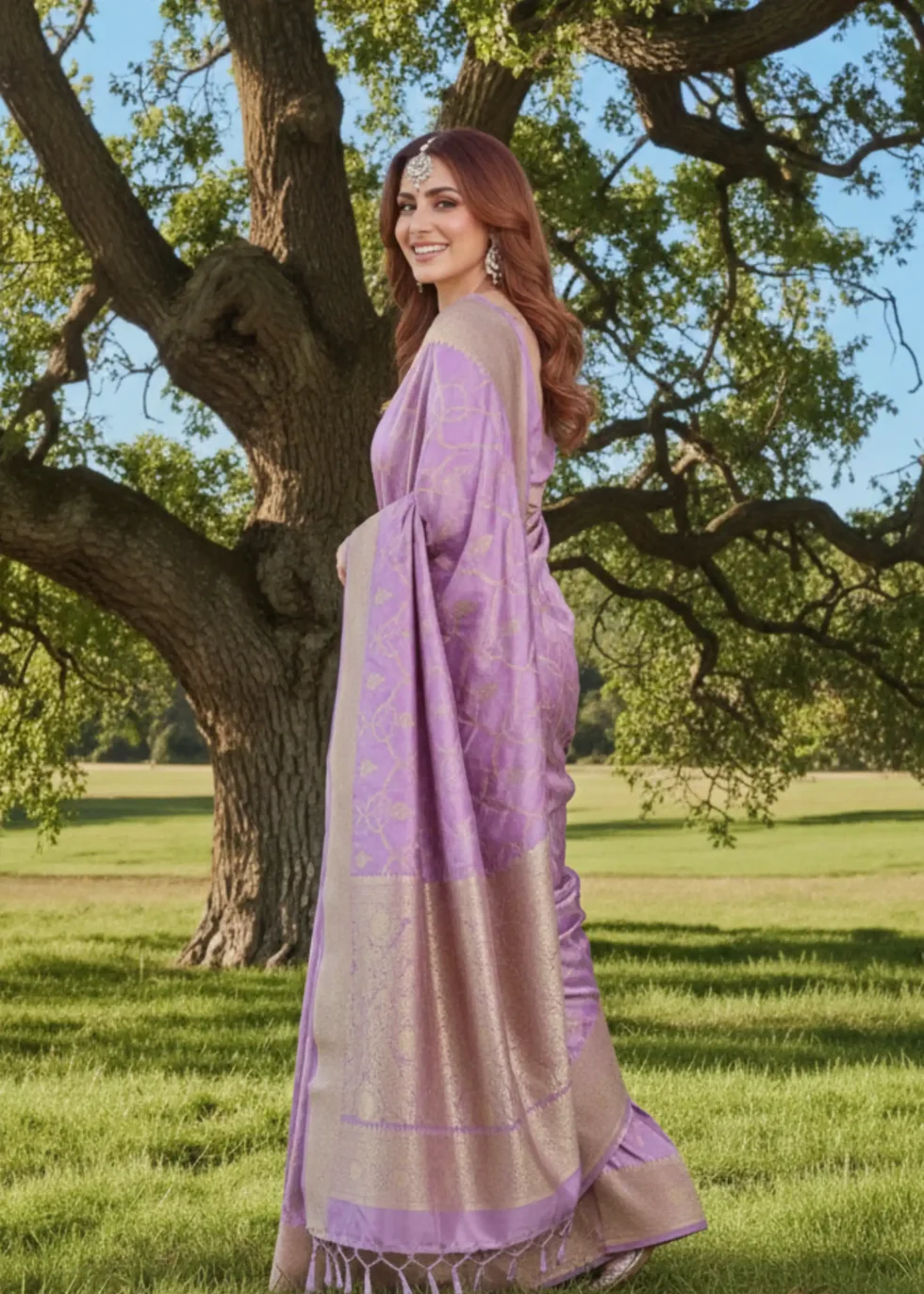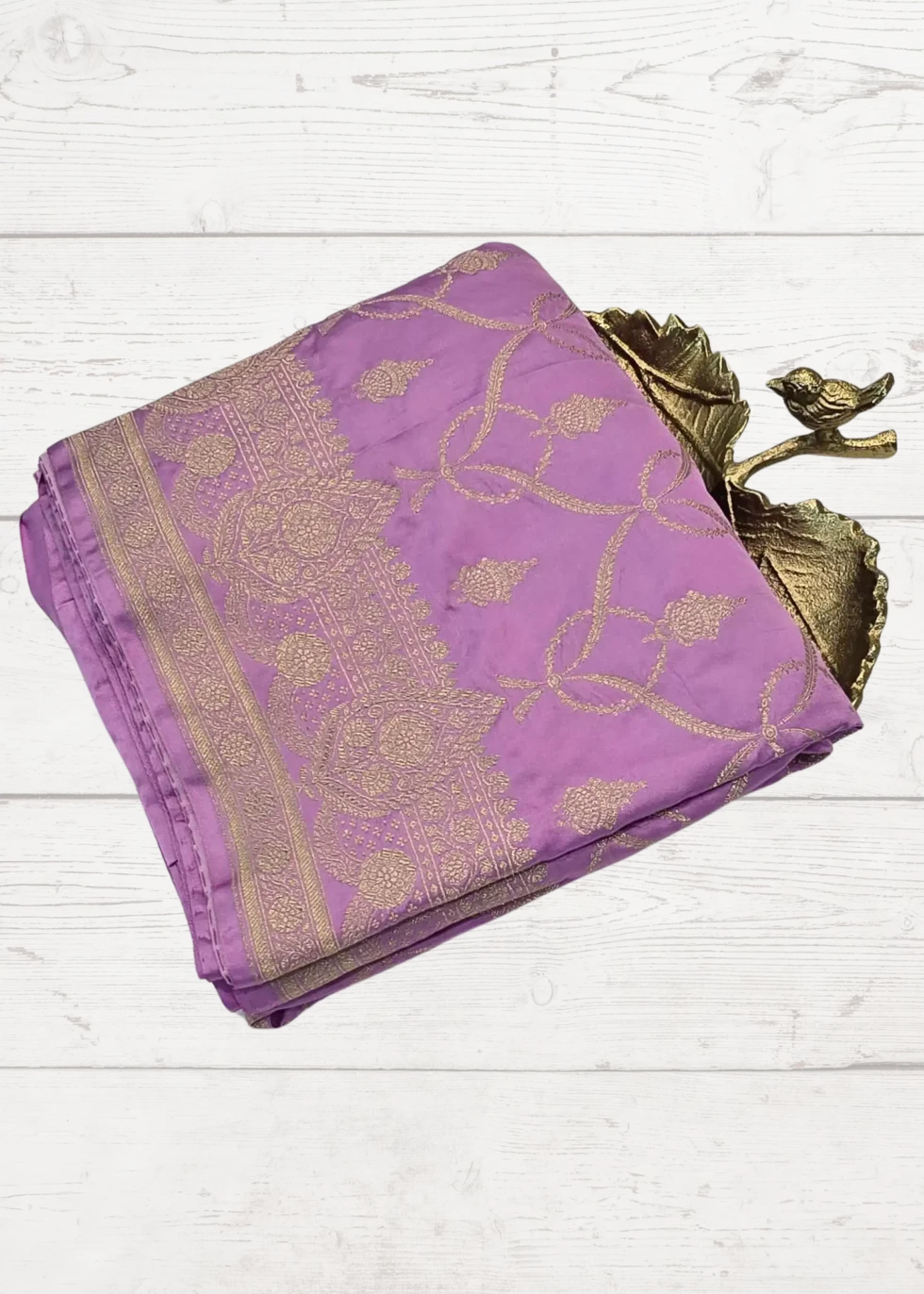 A lavender mashru silk Banarasi saree with gold jaal weaving