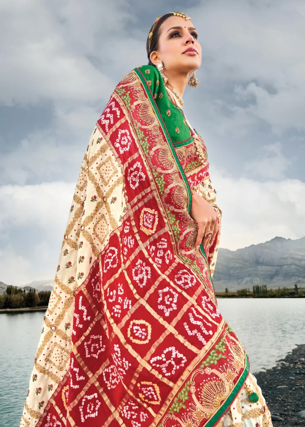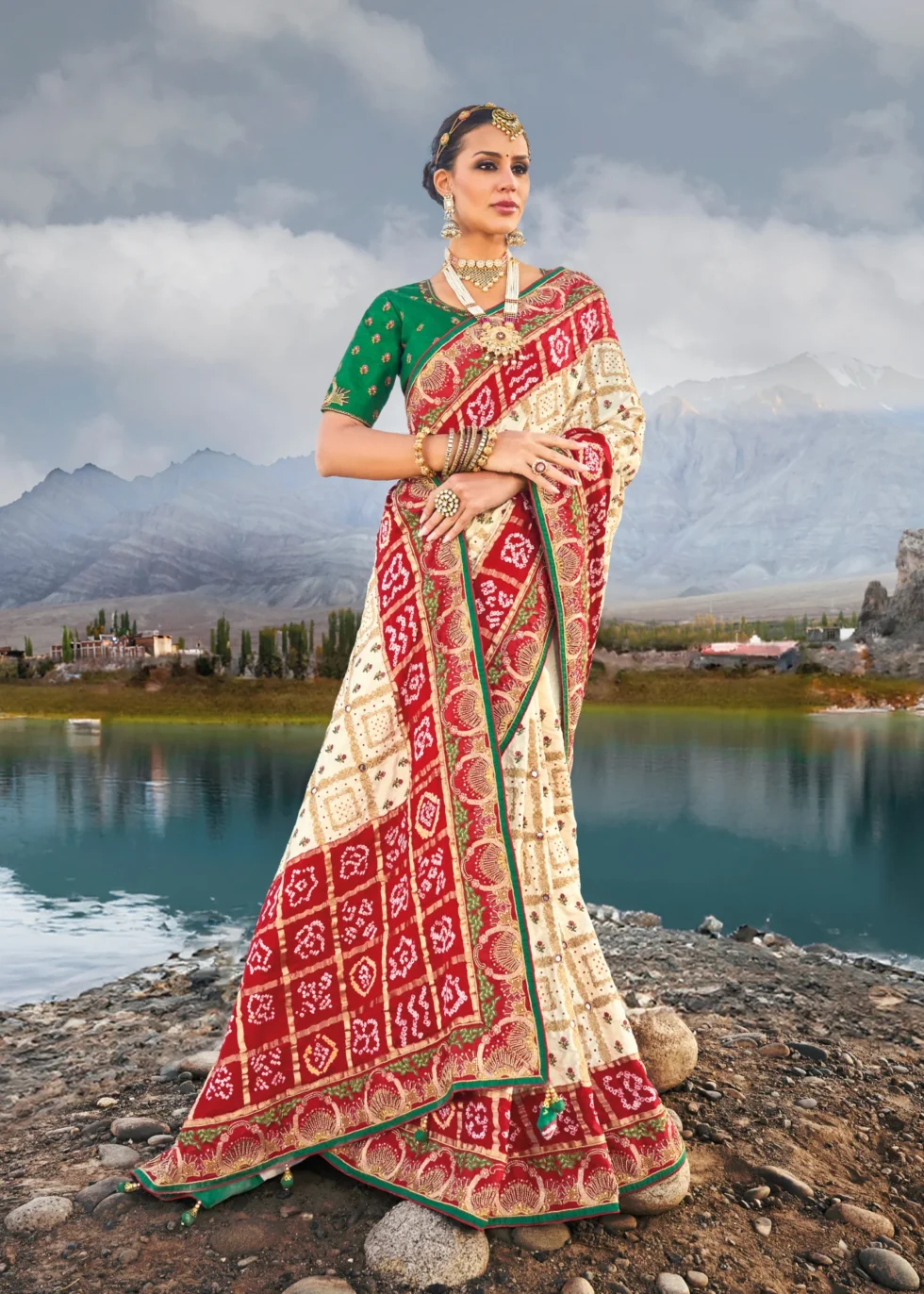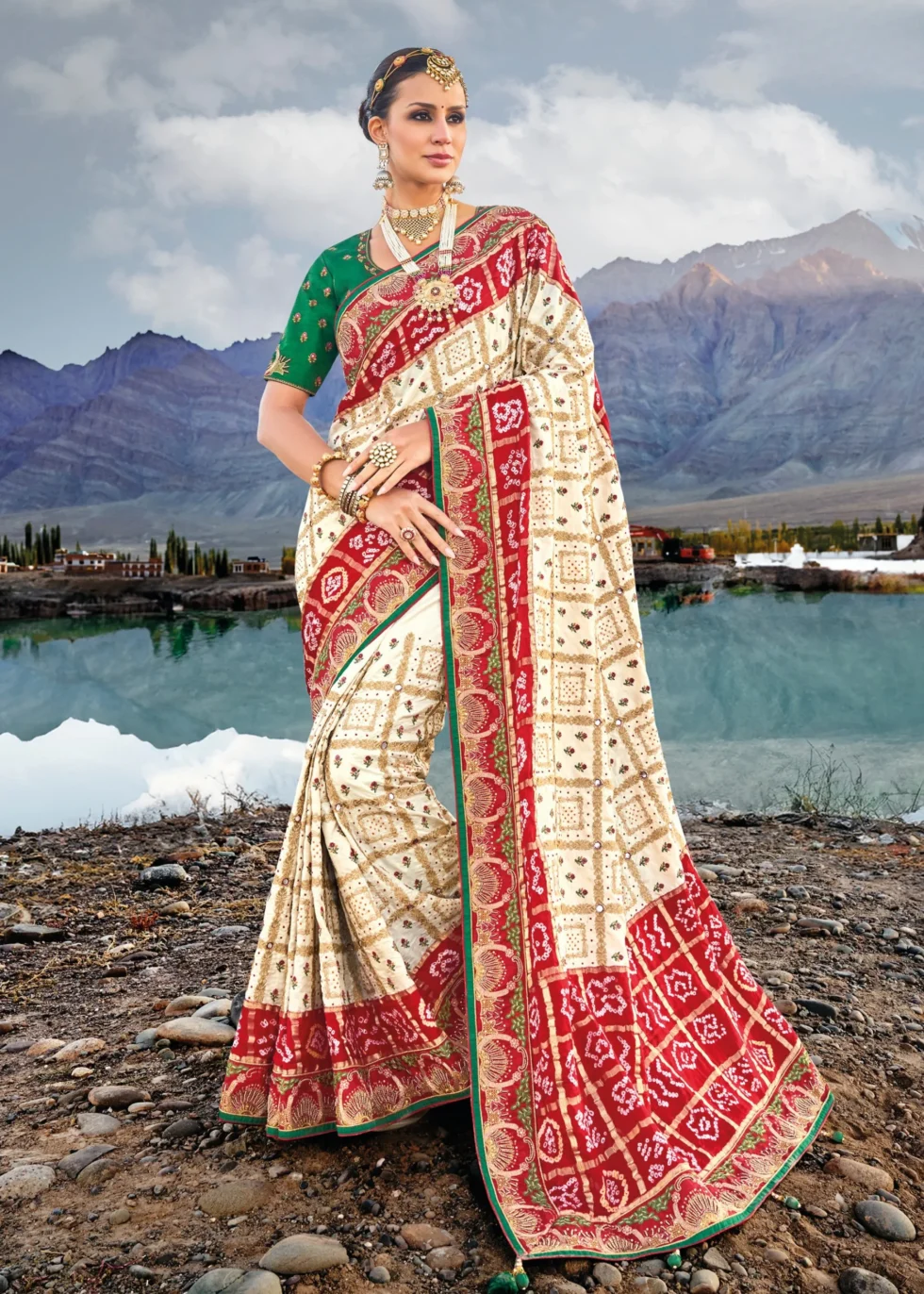 A rare gharchola and paneter combination silk saree in white and red with designer blouse