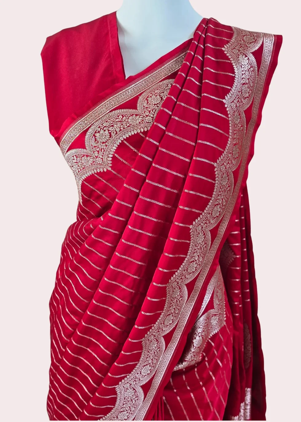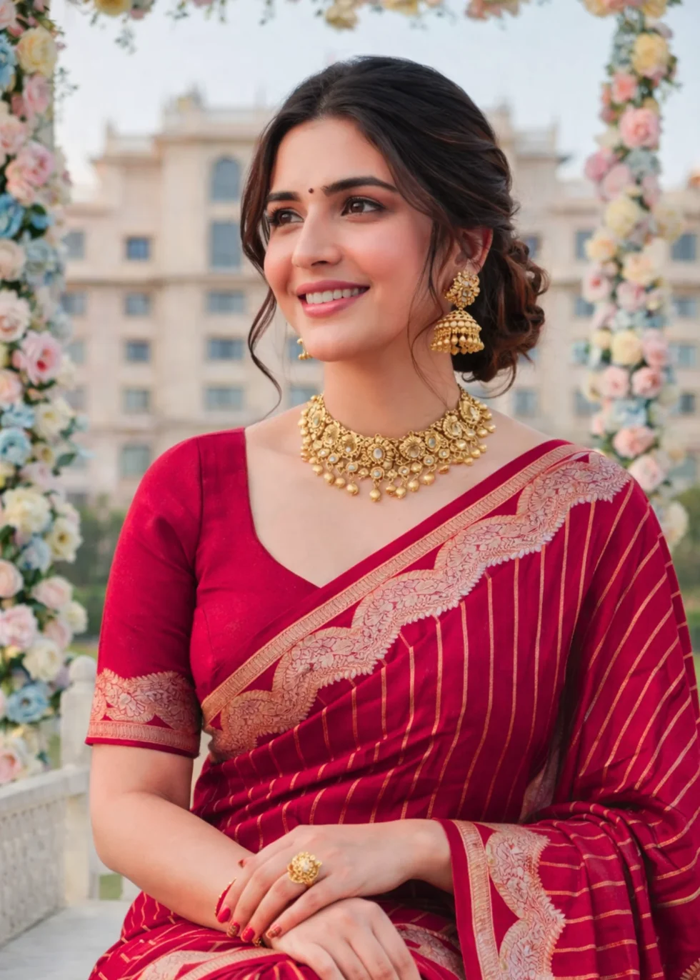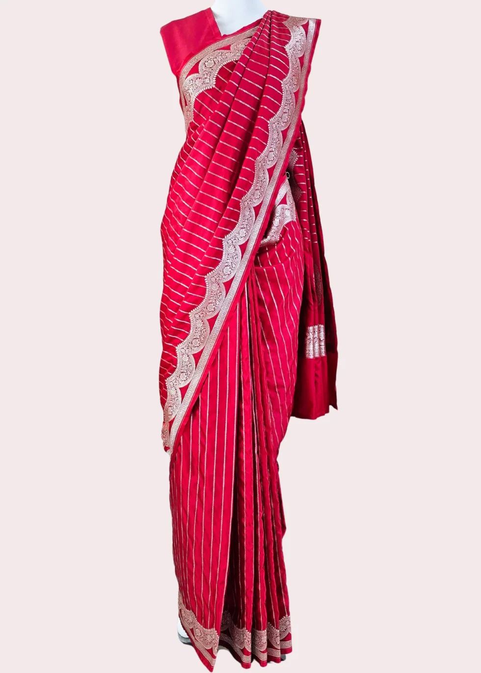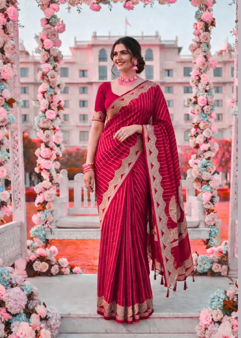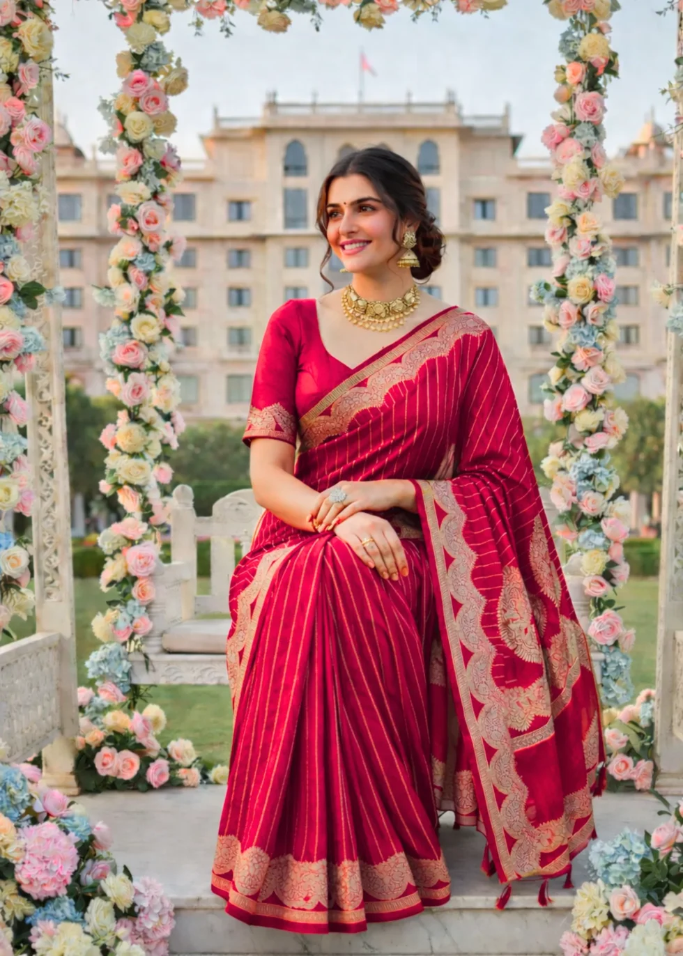 A kumkum red Banarasi saree with elegant border and vertical stripes