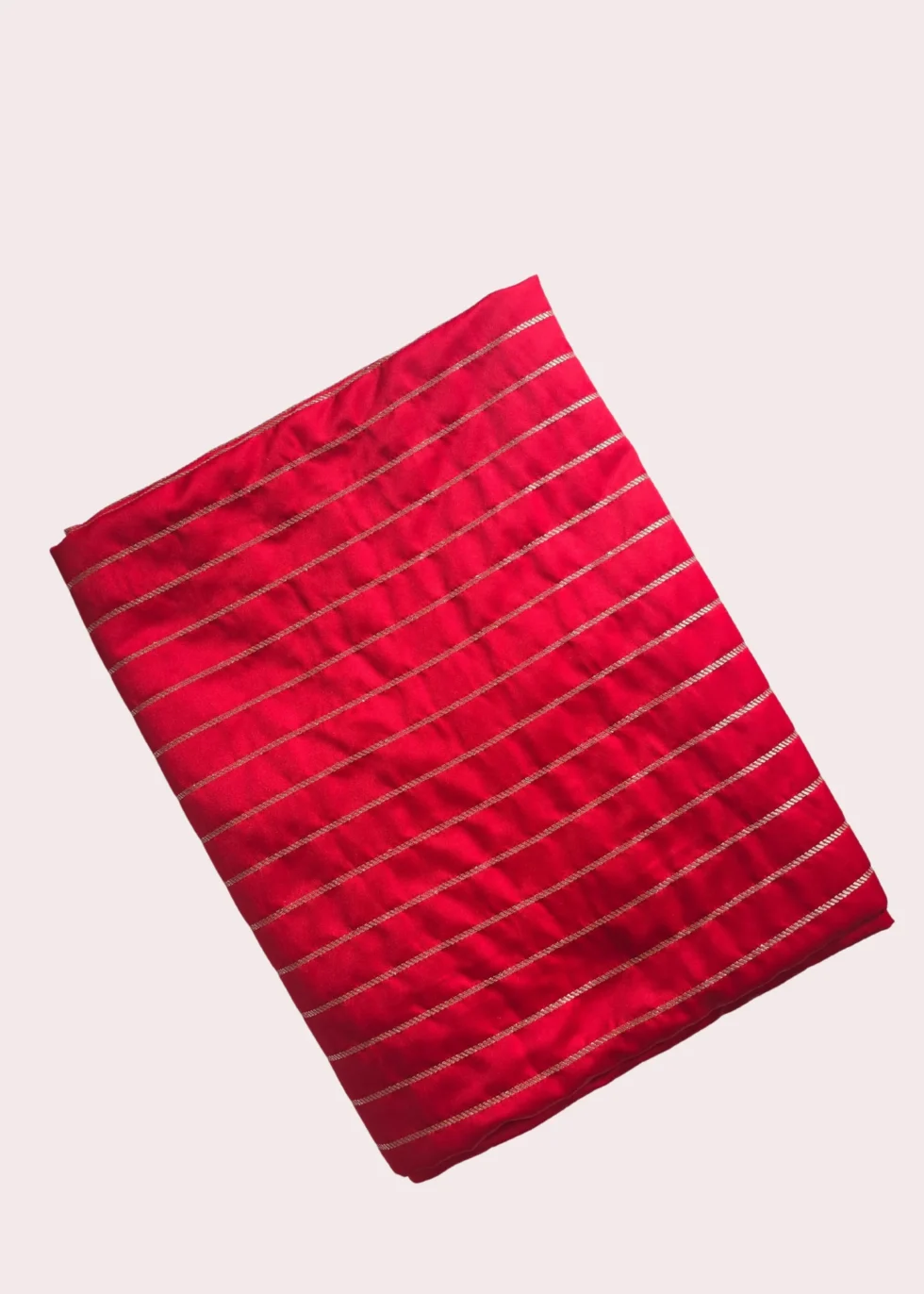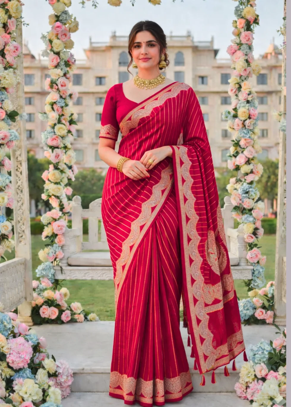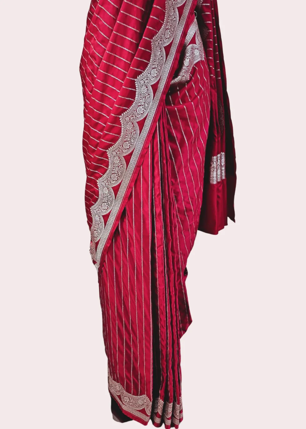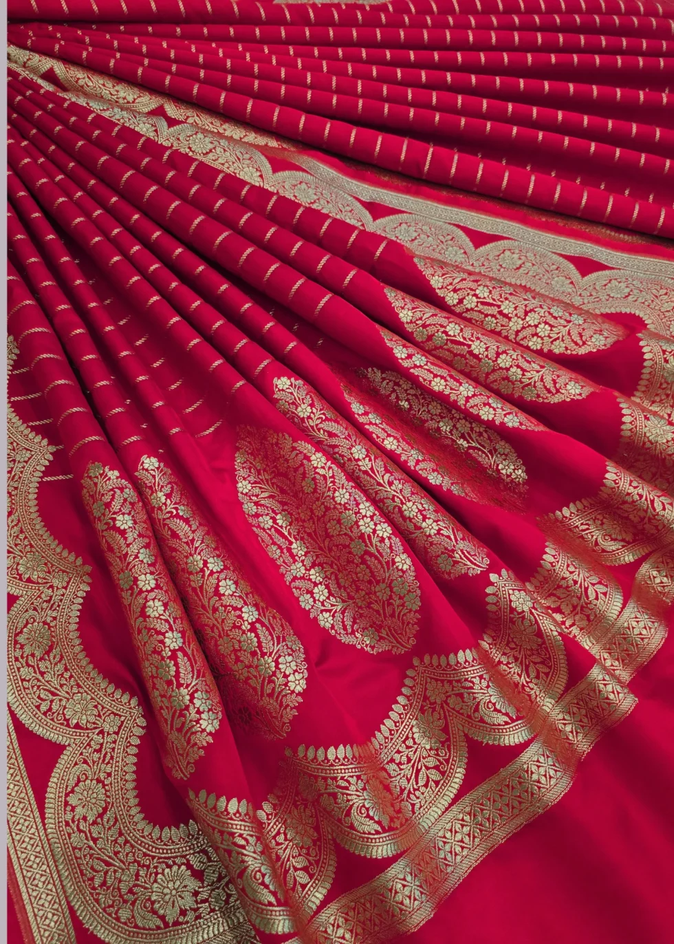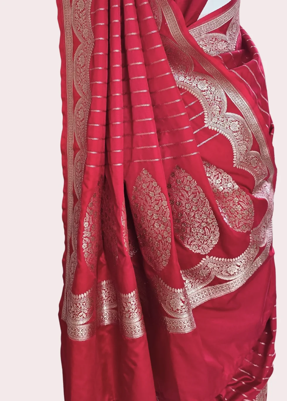 A kumkum red Banarasi saree with elegant border and vertical stripes