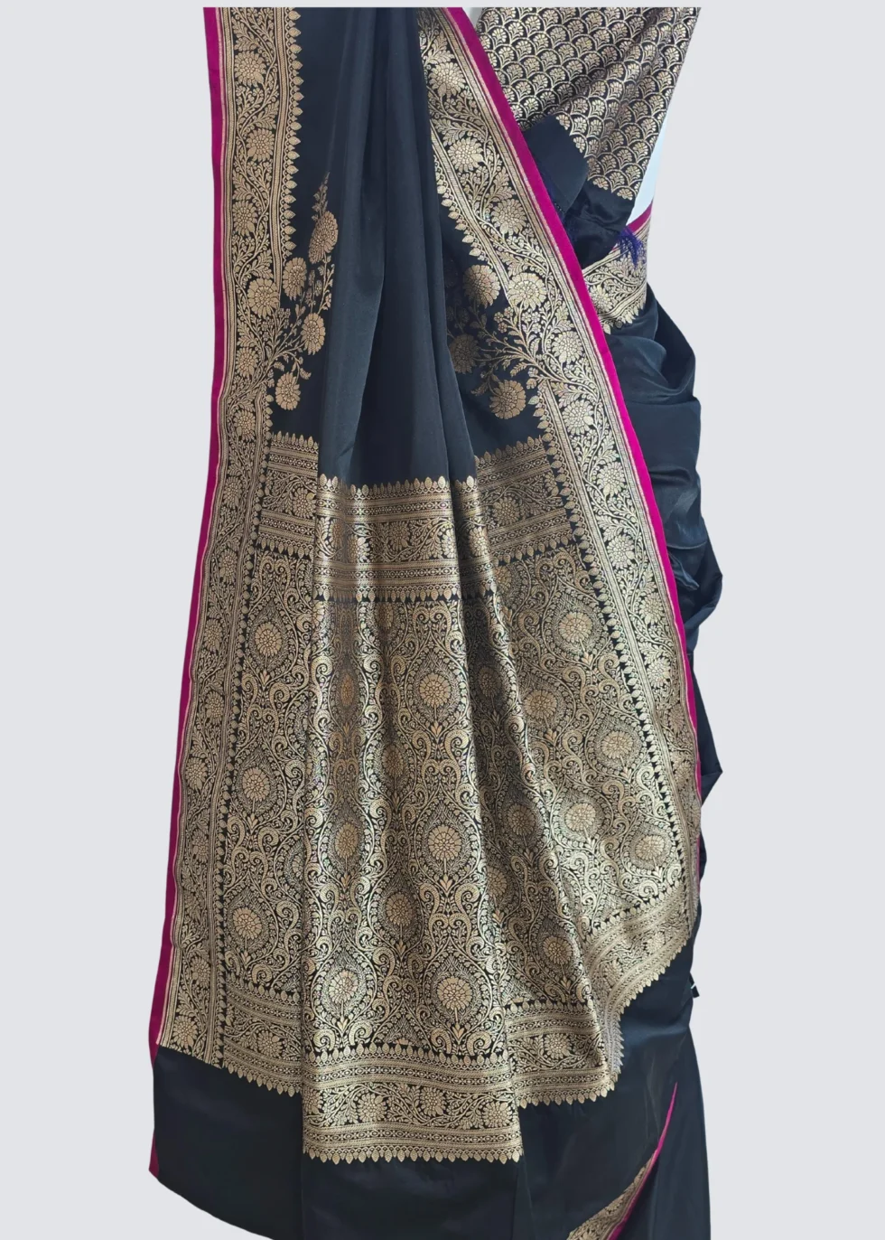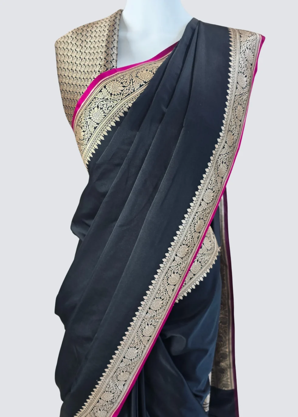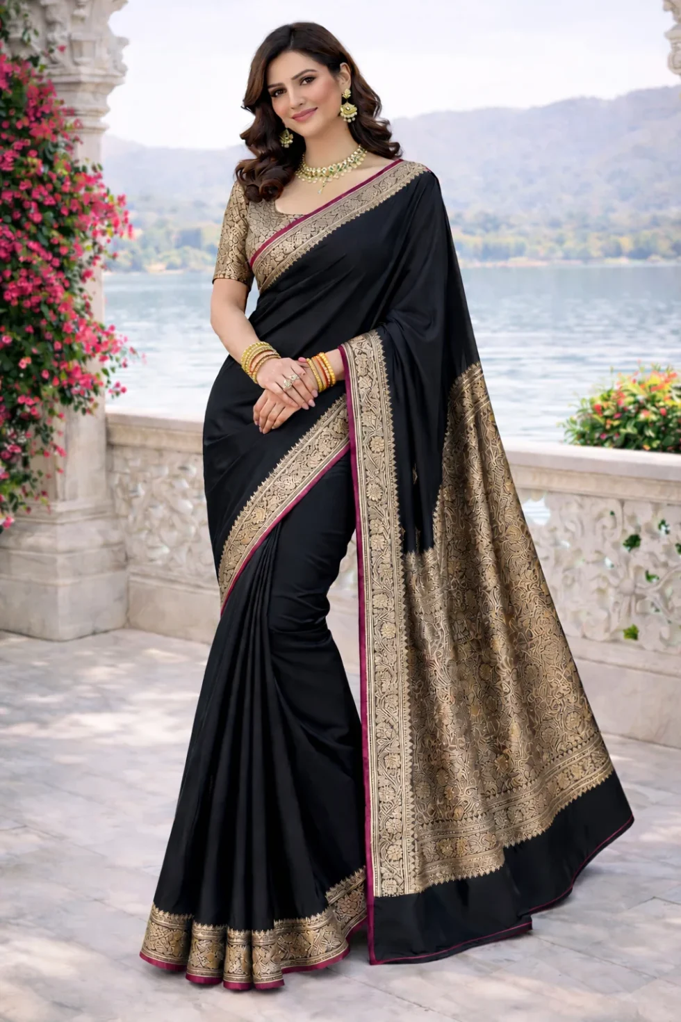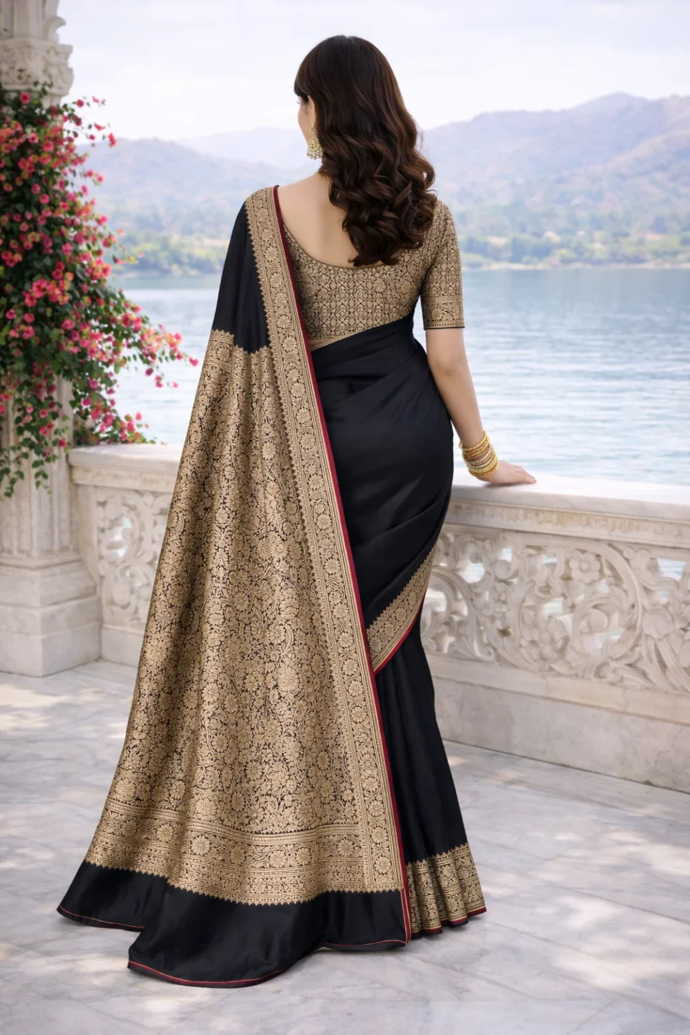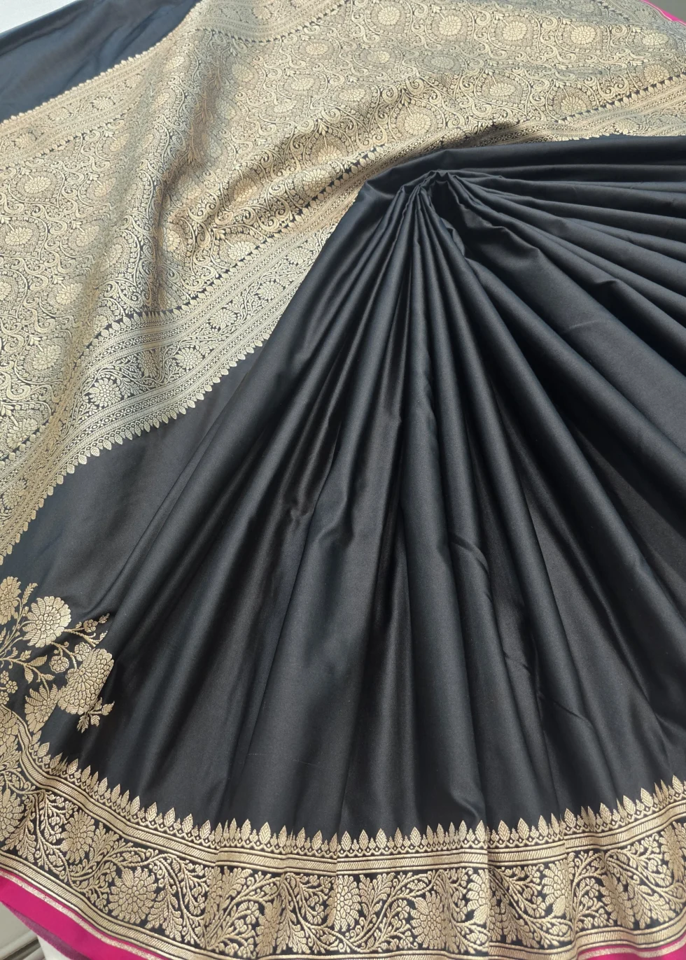 Simple yet scintillating black Banarasi in soft Mashru silk