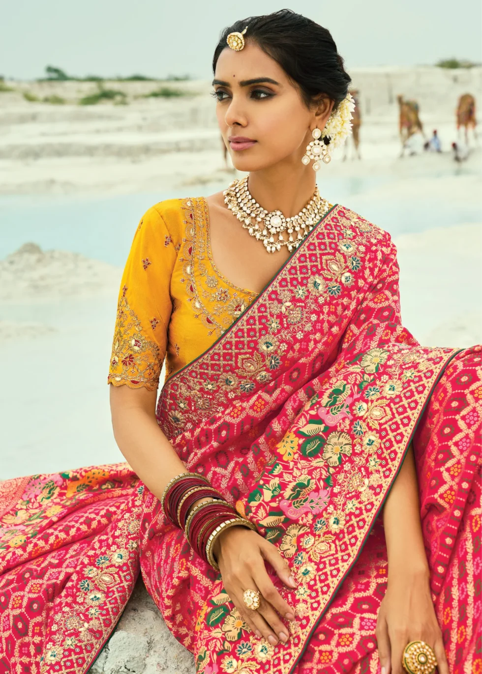 A Bandhani red georgette saree with heavily embroidered borders, pallu and option of 2 blouses