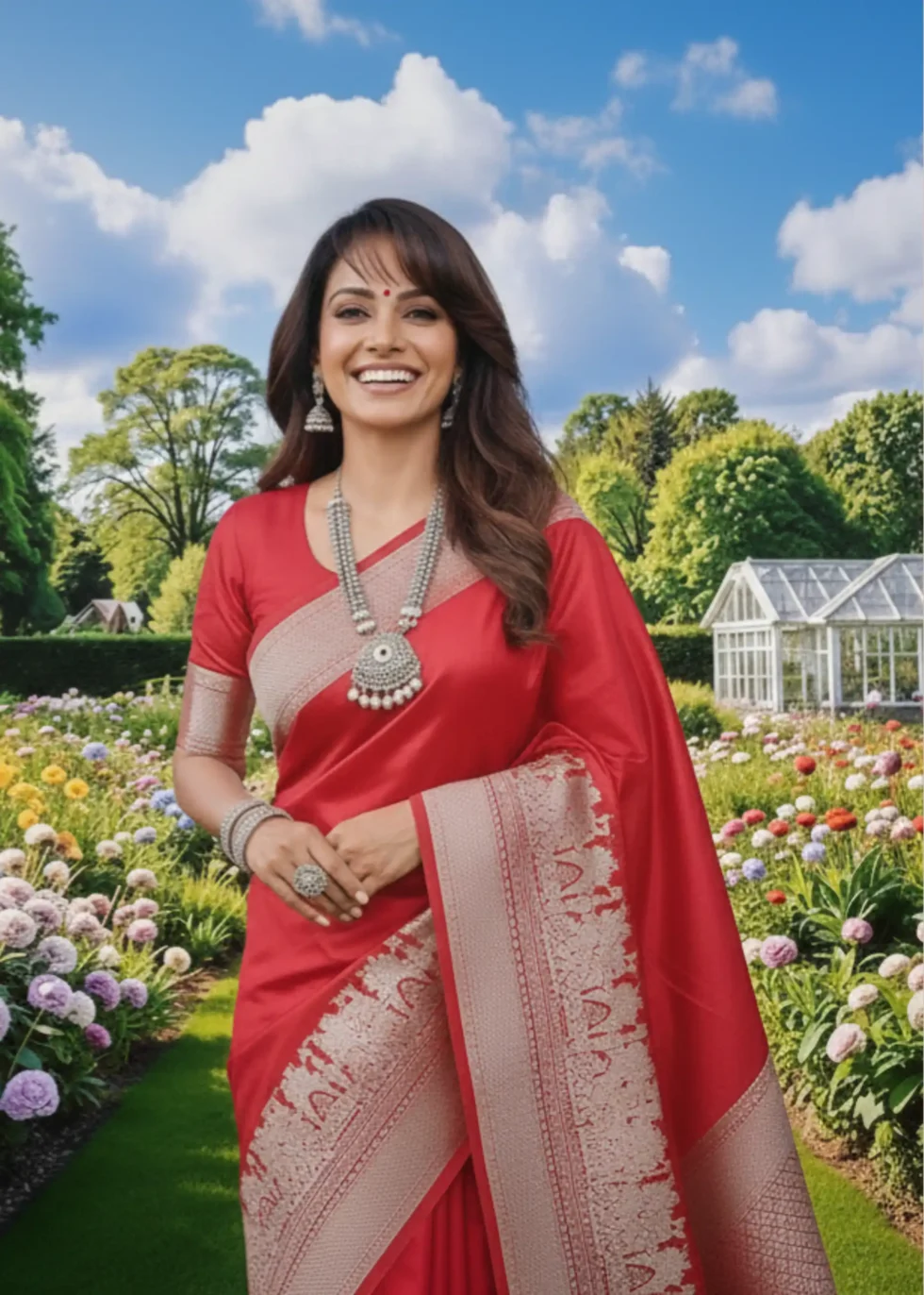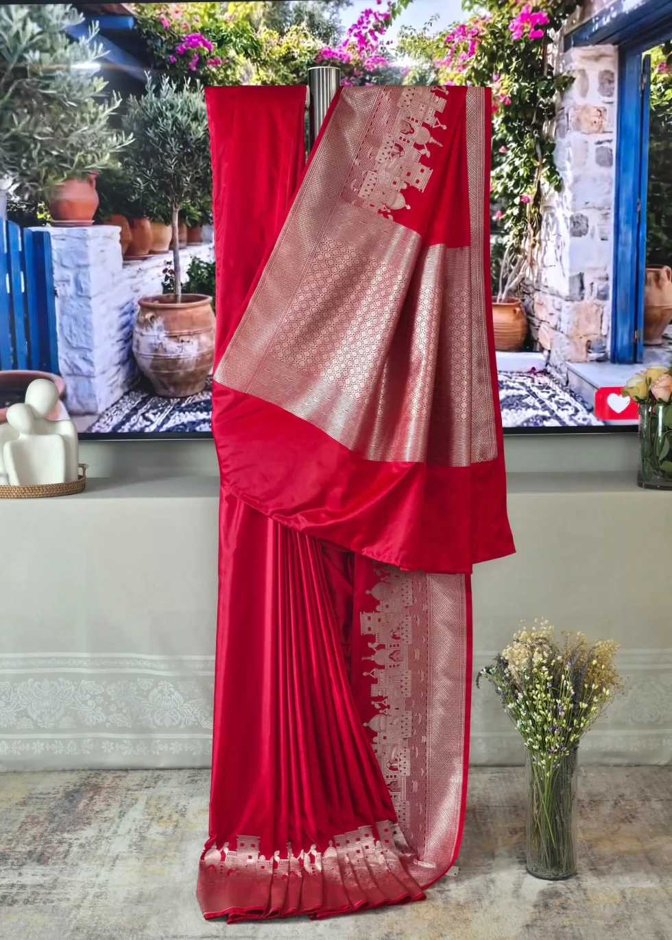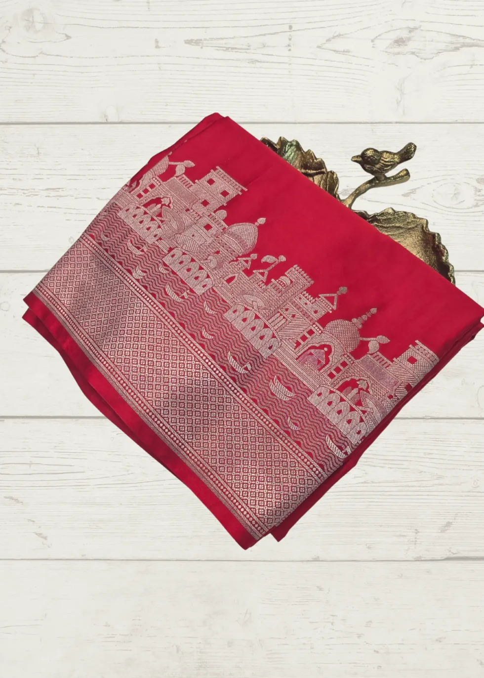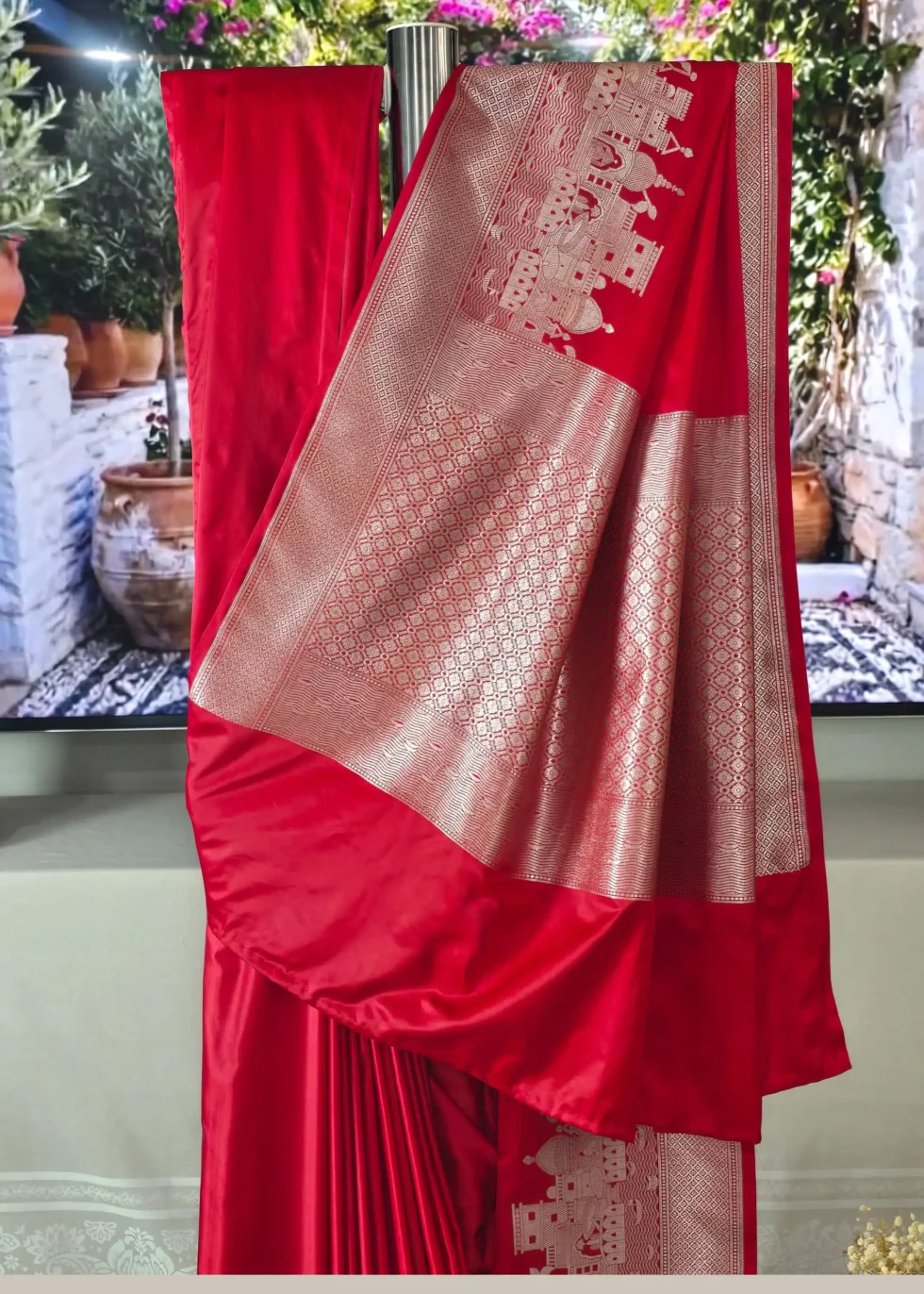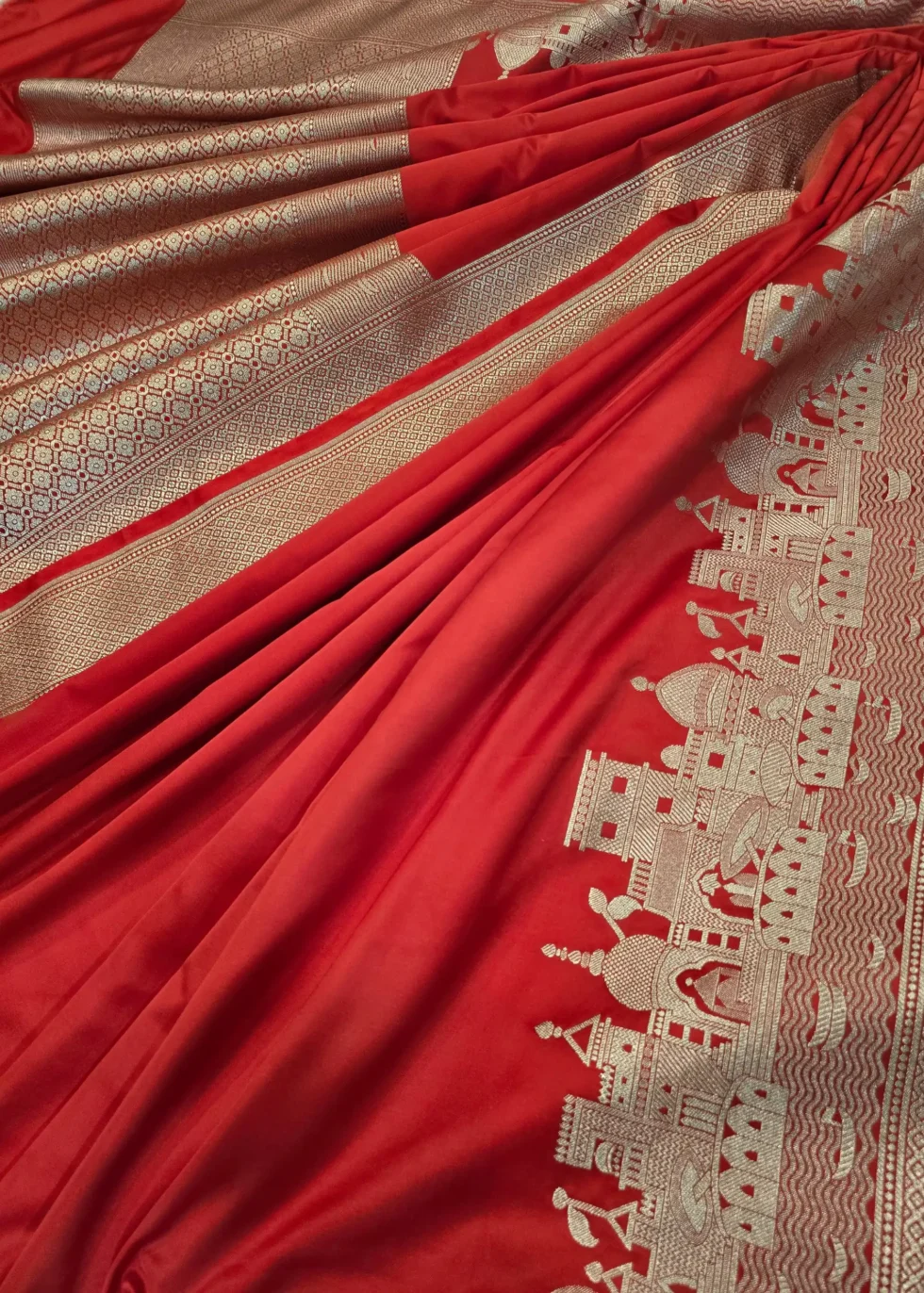 A striking red Banarasi in Mashru silk with the heritage Banaras ghat border