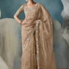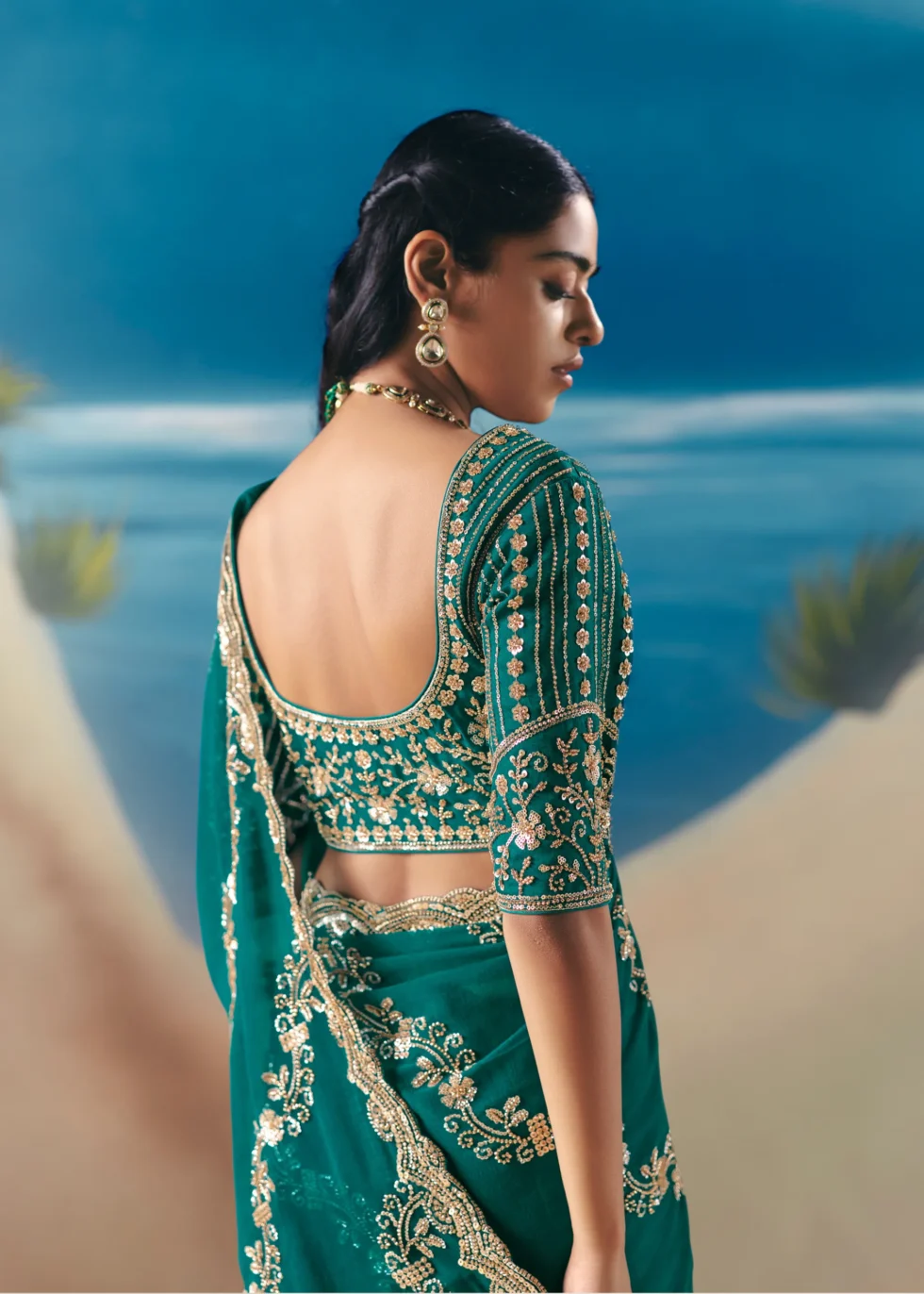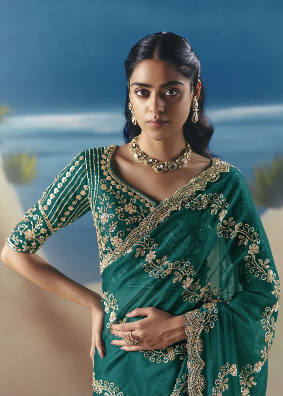 Sage green saree in light flowy fabric with all over embroidered embellishment