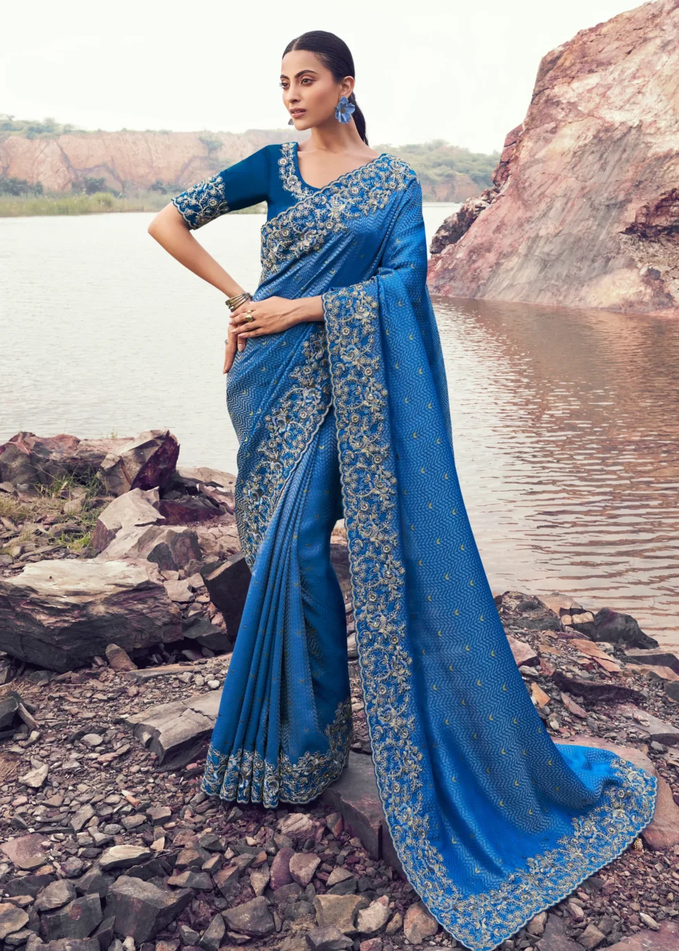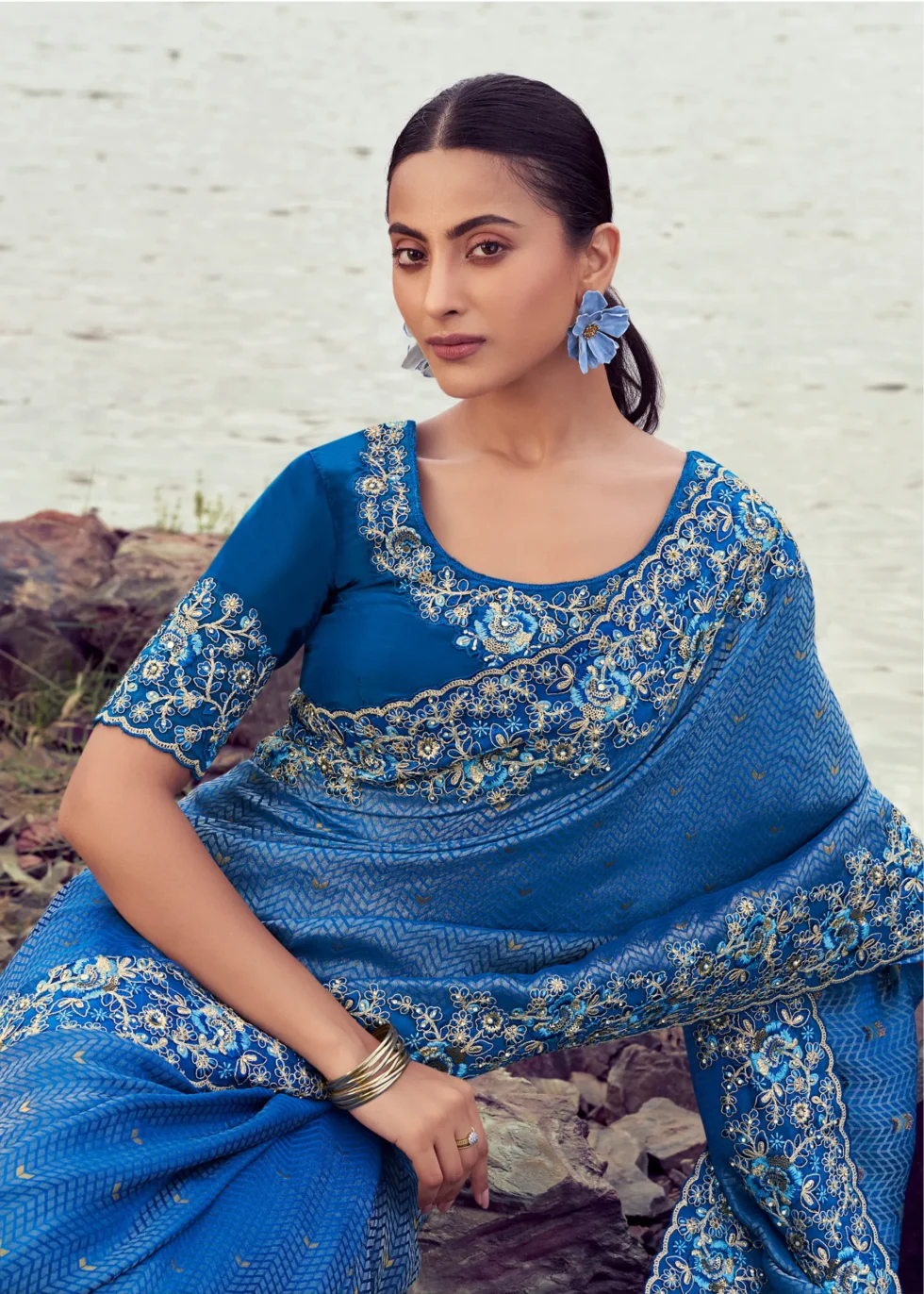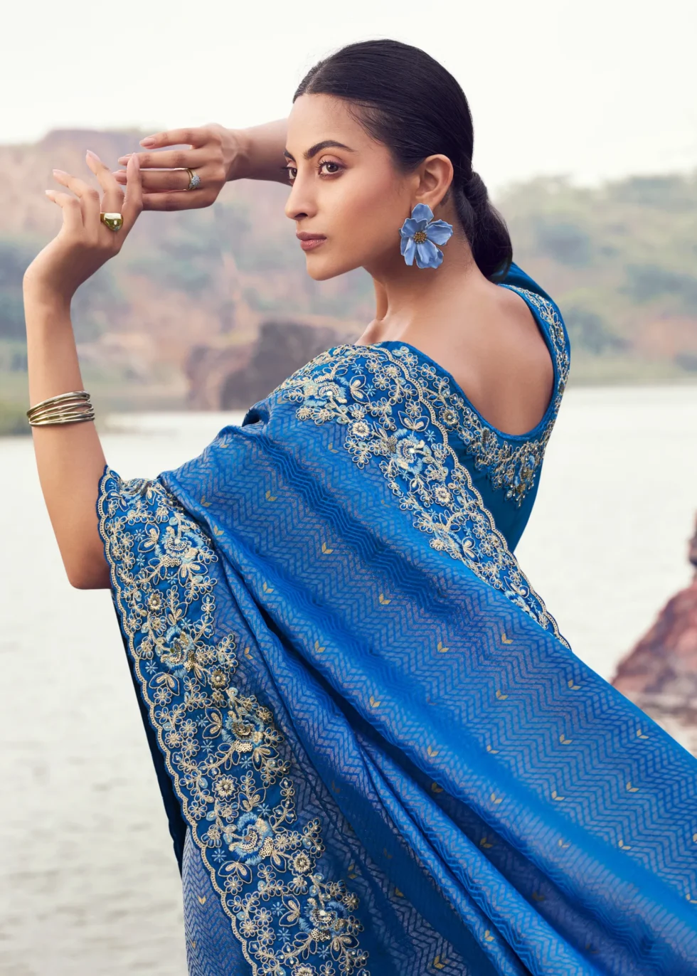 An electric blue silk saree with delicate embellishment of floral embroidered borders and designer blouse