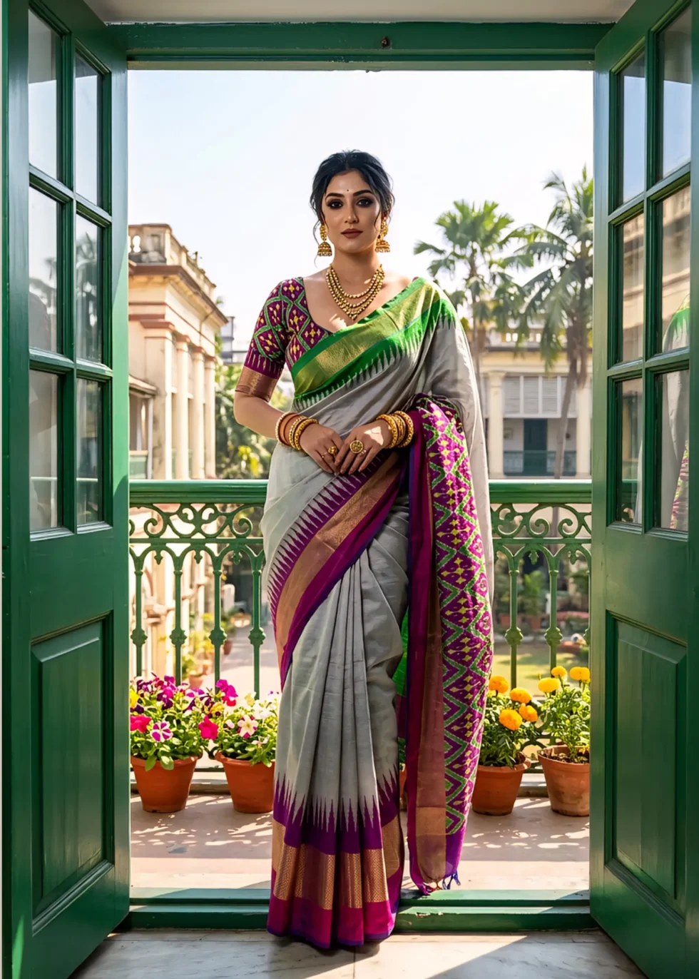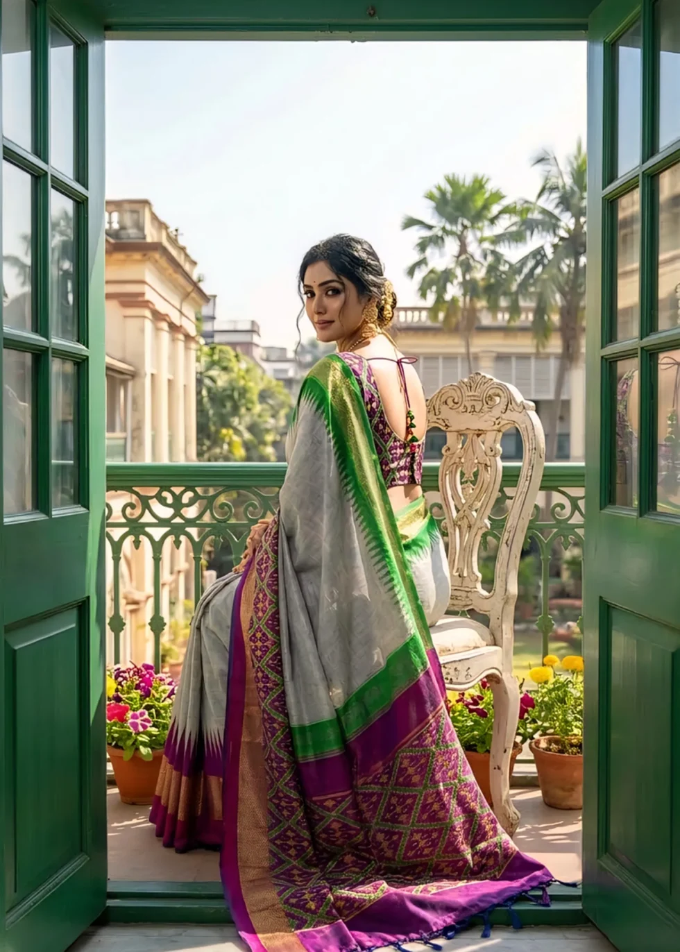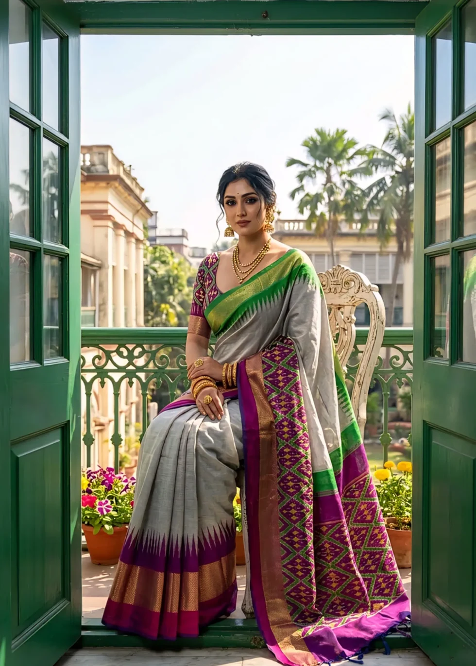 Pochampally Ikkat pure silk saree in Silver gray with multicolour Ganga-jamuna borders