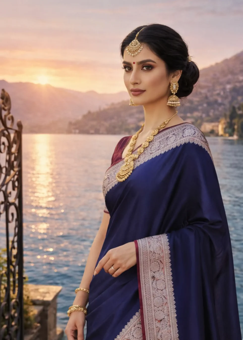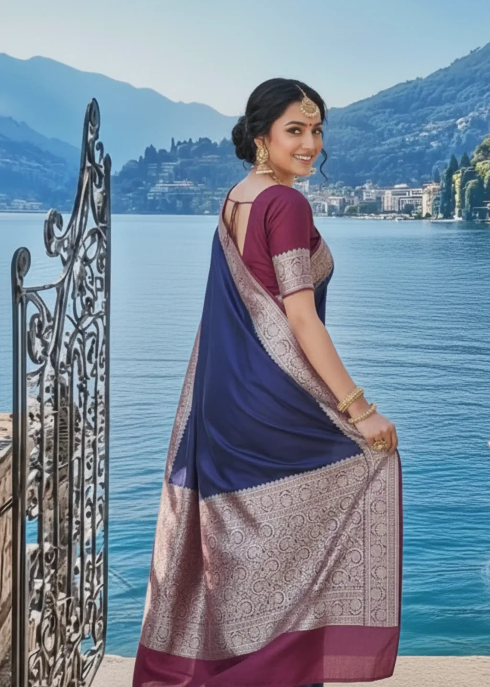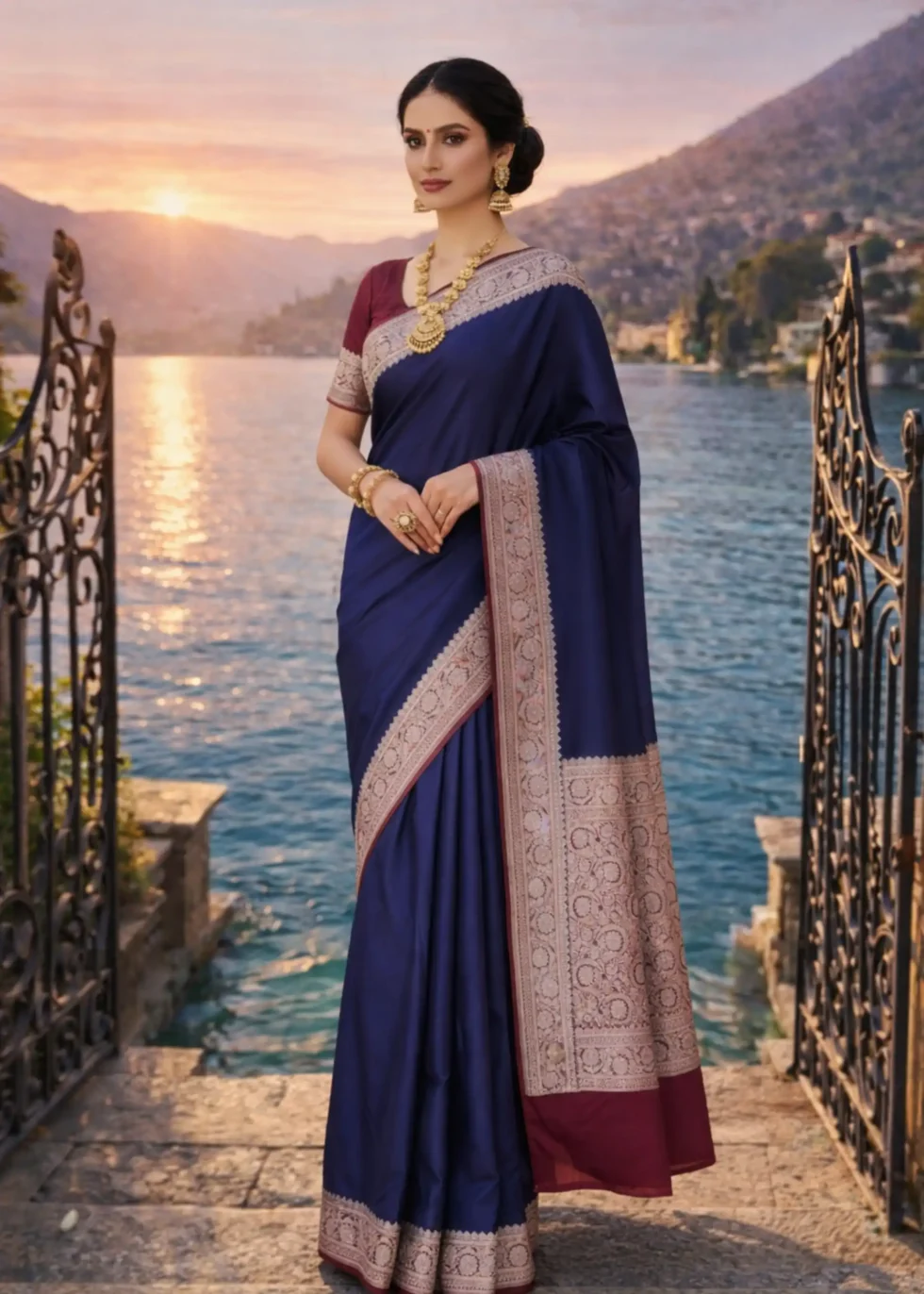 A plain yet elegant deep blue Banarasi mashru silk saree with red borders