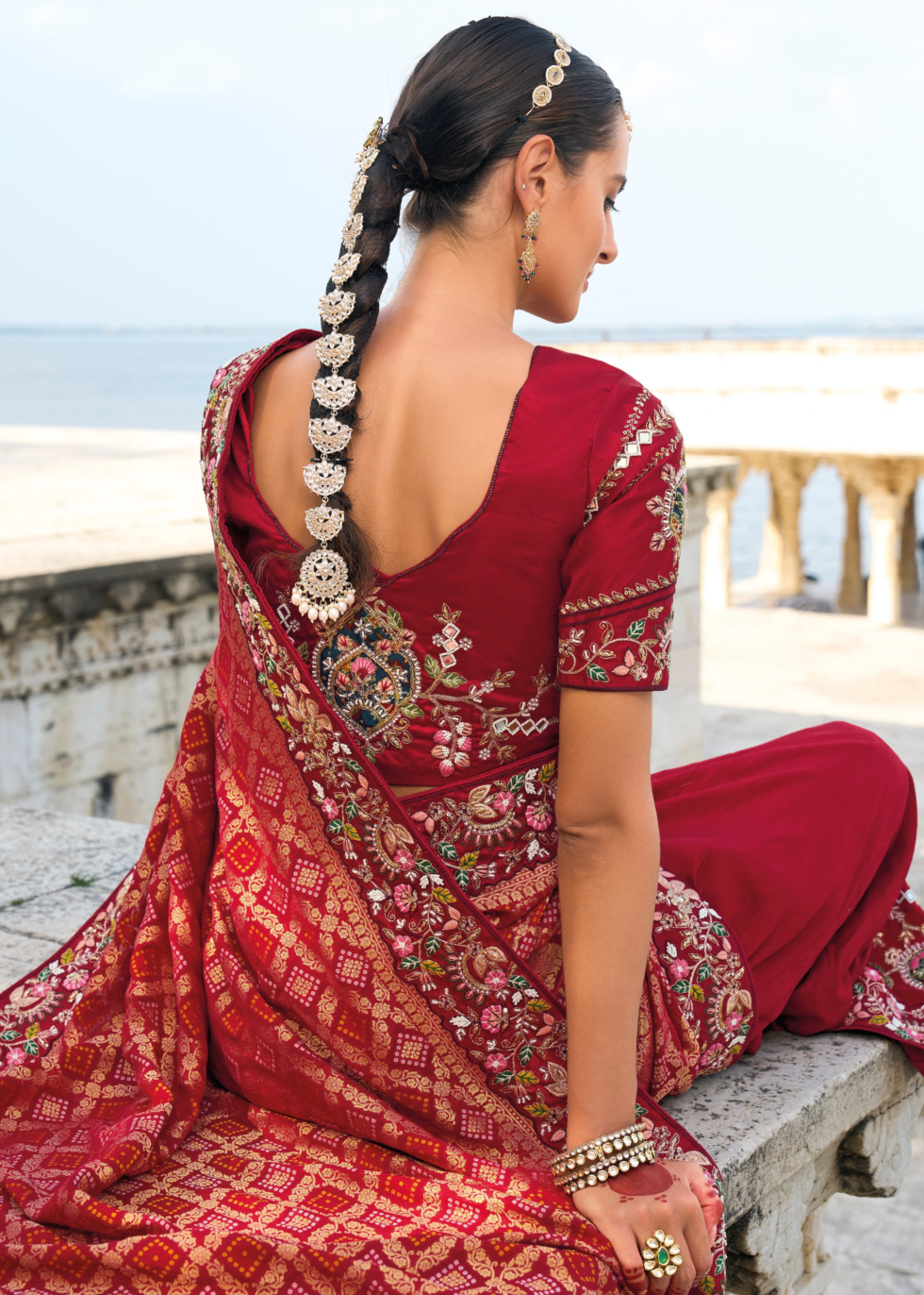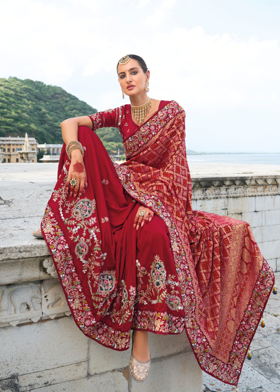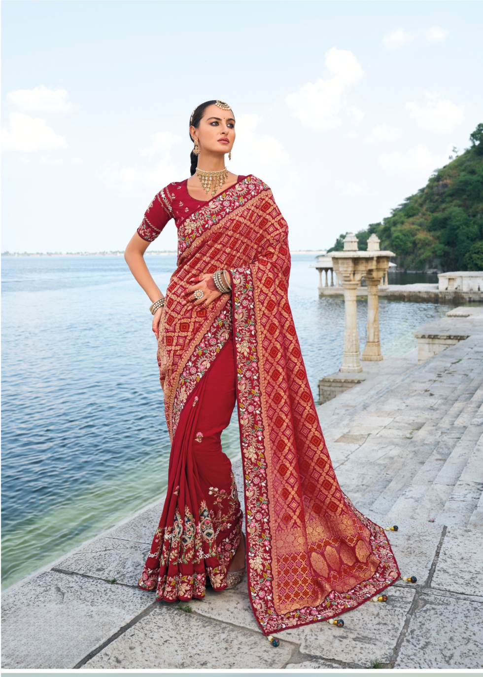 A georgette red saree with heavy embroidery on broders accentuated with a fusion bandhani pallu and desginer blouse