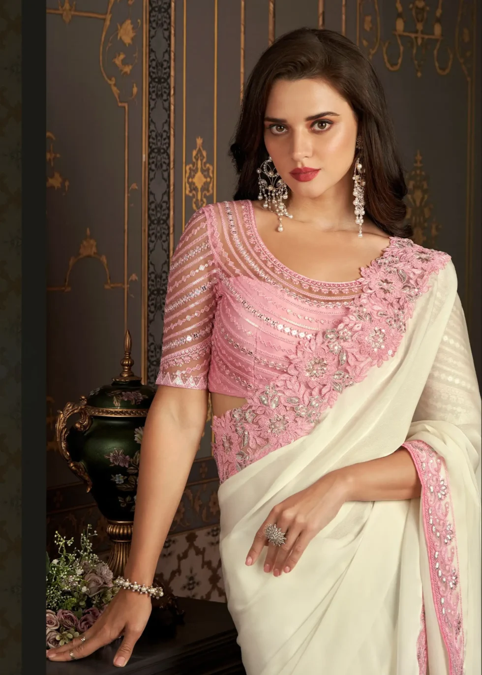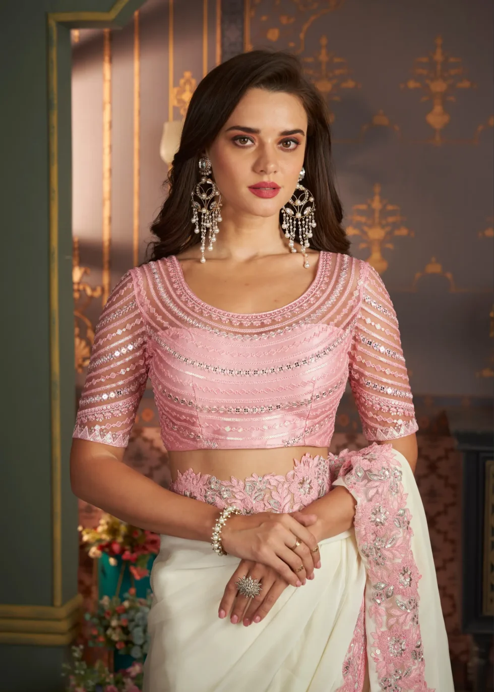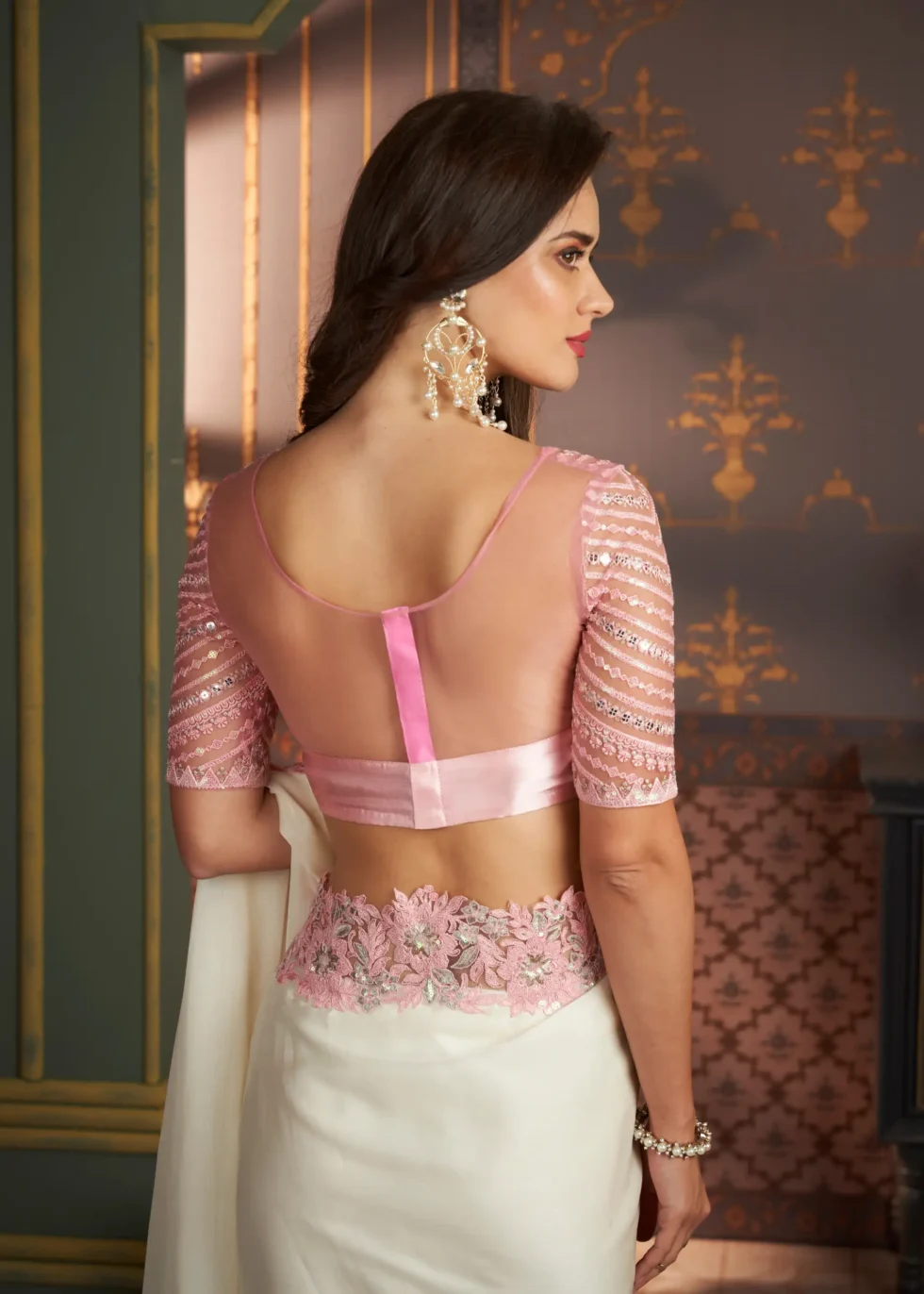 A delicate white and pink saree in tissue silk with embroidered embellishment and pink designer blouse.