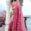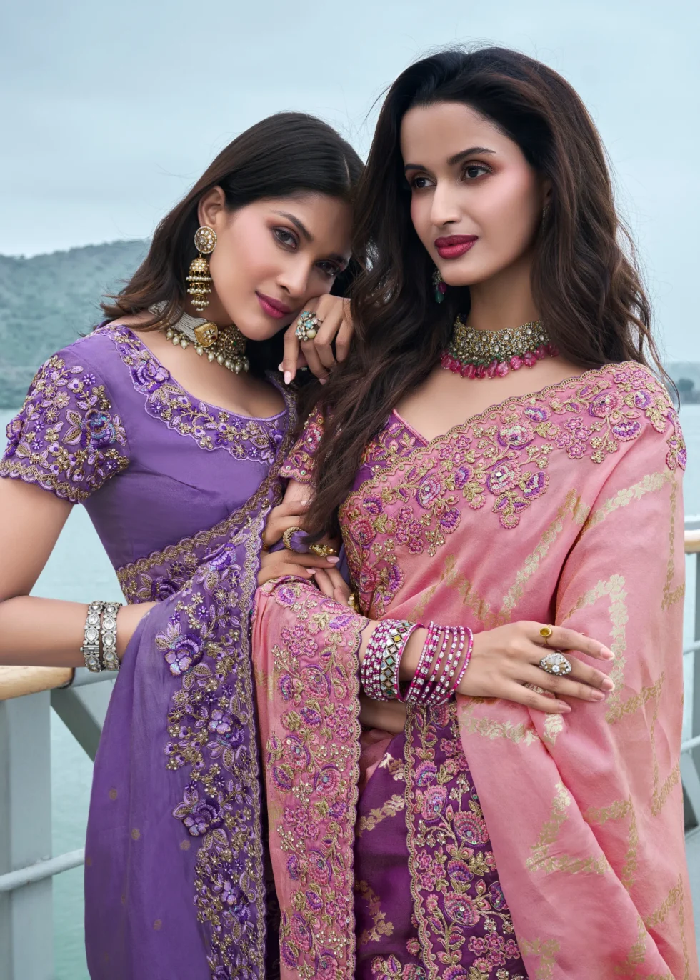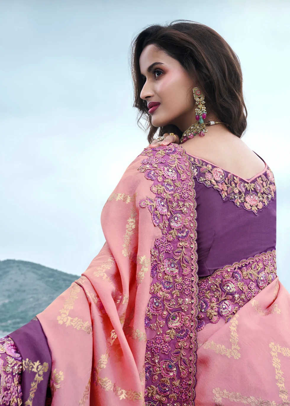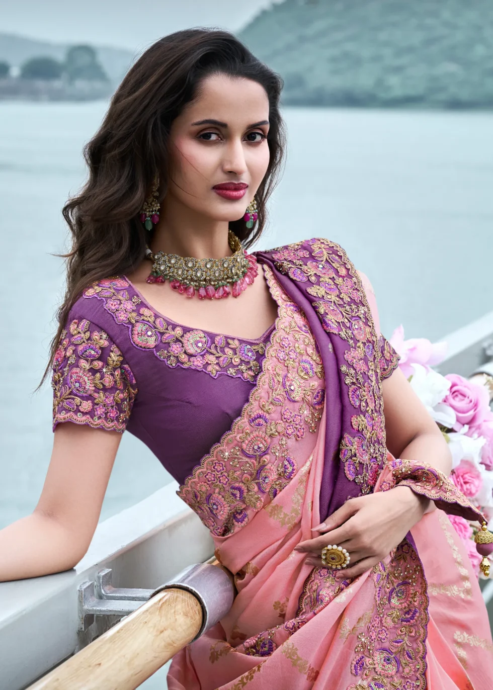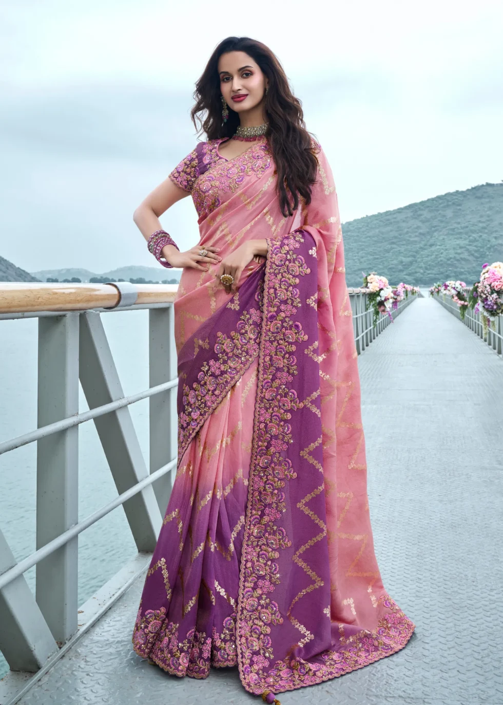 Pink and lilac ombre saree in tissue organza with embroidered embellishement