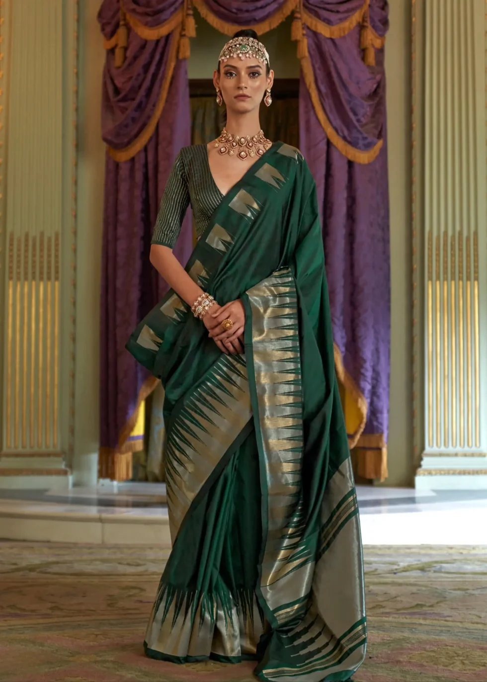 The verdant green silk saree with gold and silver temple border.