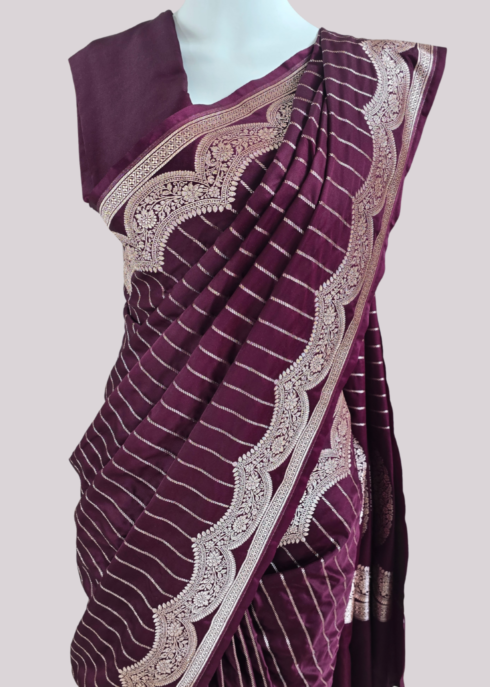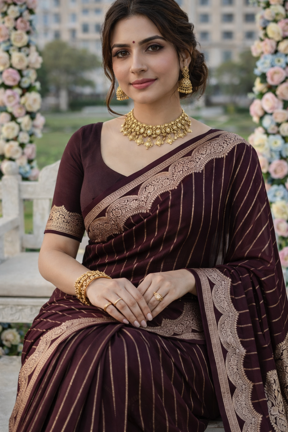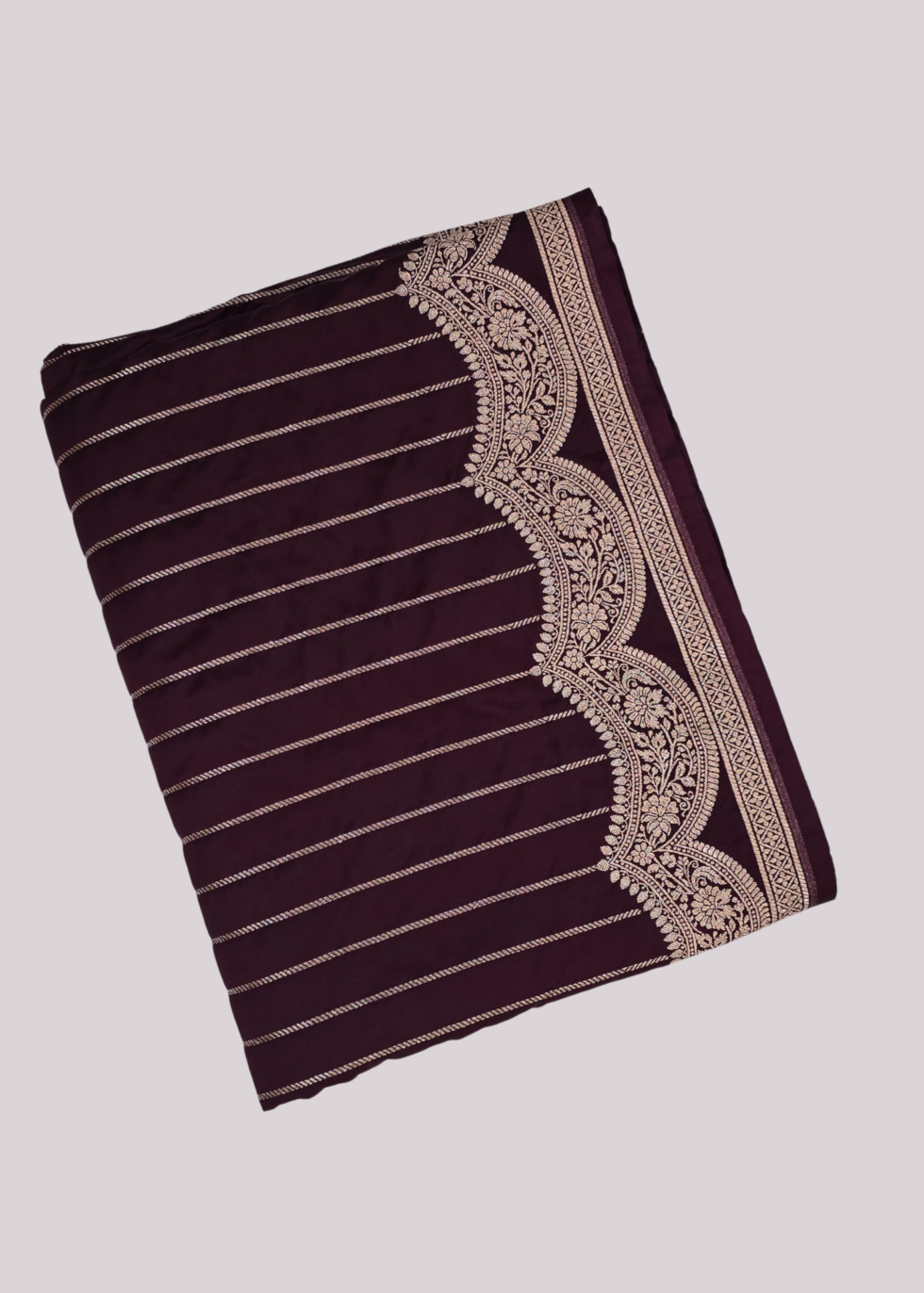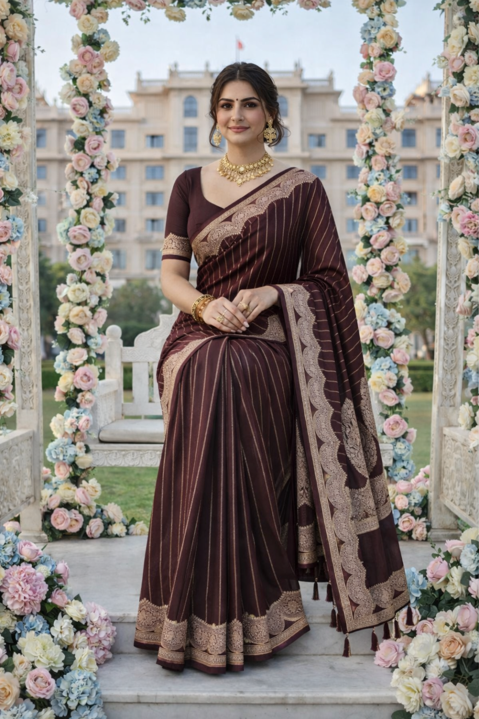 A coffee brown Banarasi saree with elegant border and vertical stripes