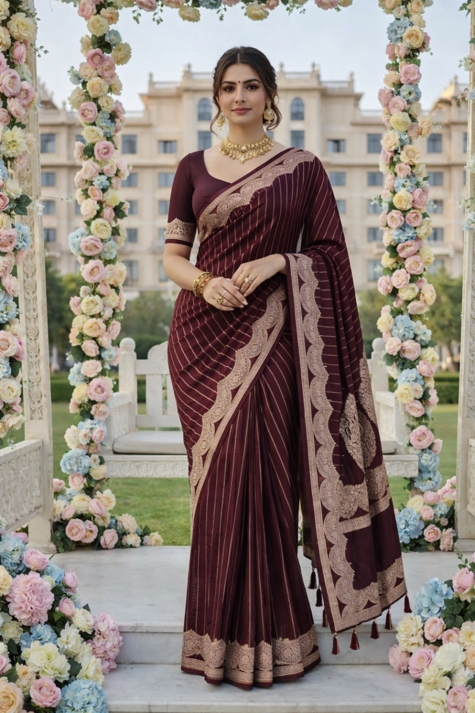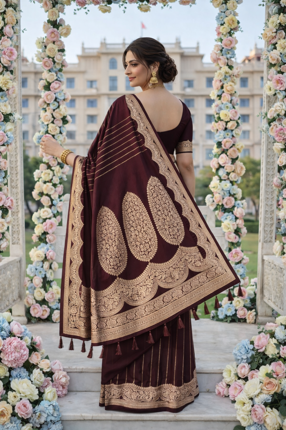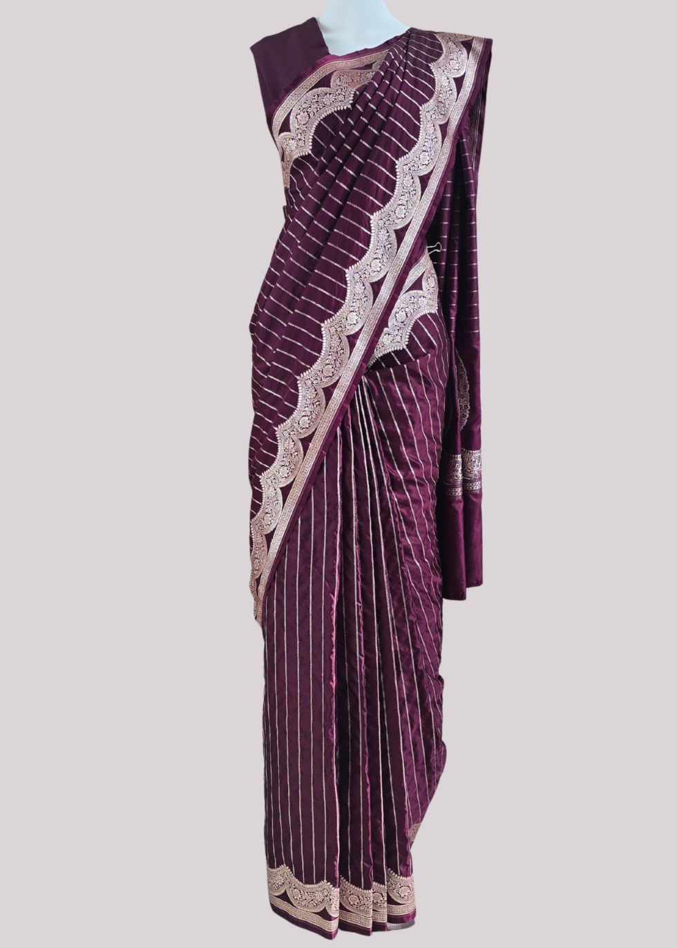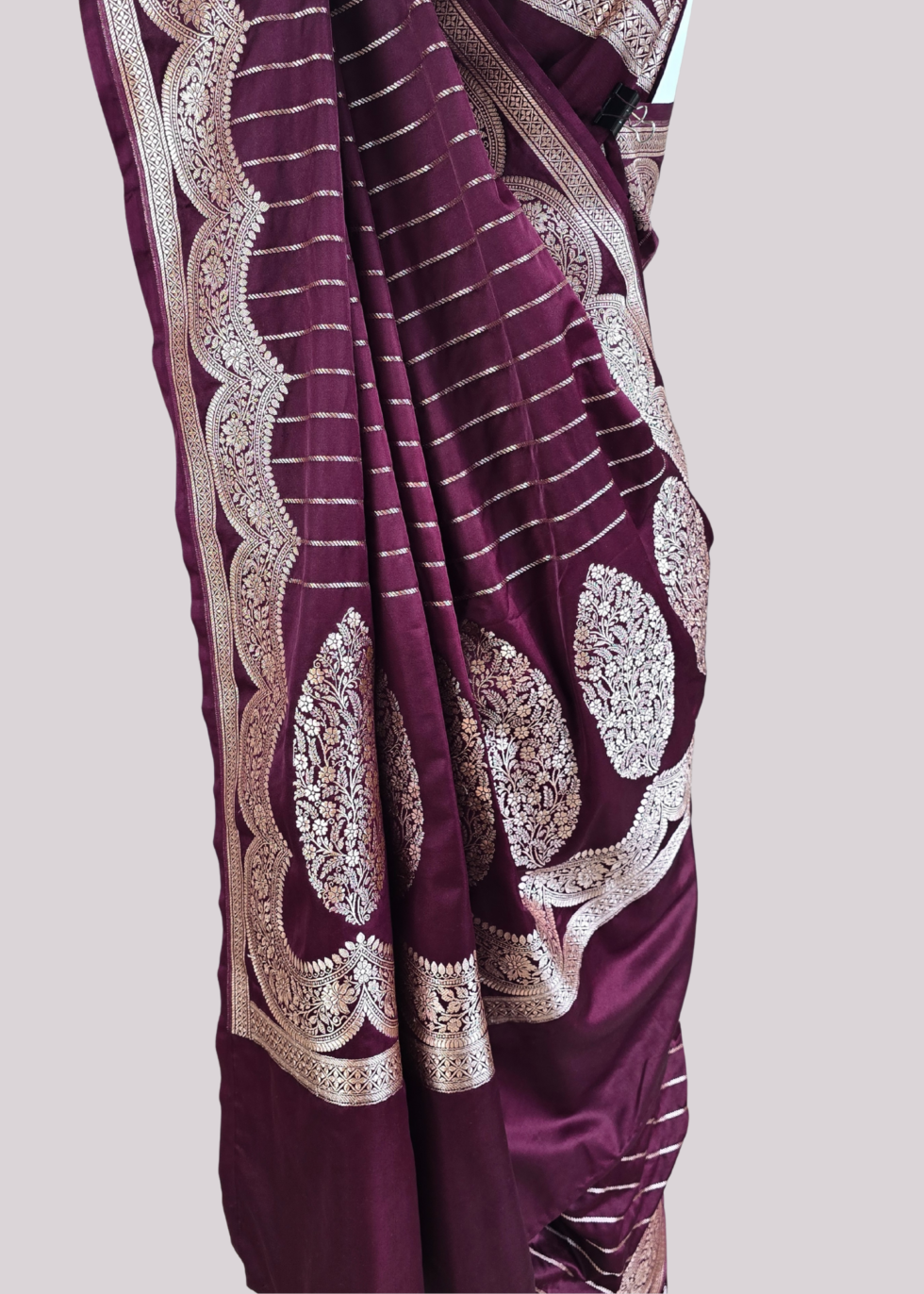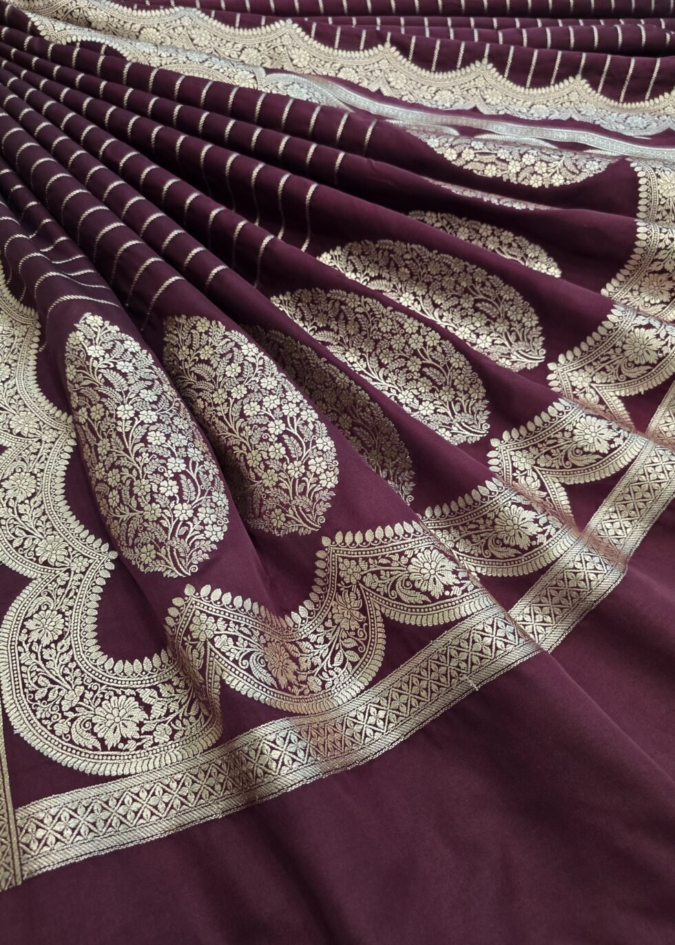 A coffee brown Banarasi saree with elegant border and vertical stripes